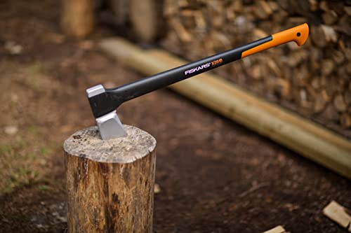 Fiskars Hacha 2,4 kg, Con estuche de almacenamiento y transporte, Longitud: 77 cm, Capa antiadherente, Cuchilla de acero/Mango de fibra de vidrio, Negro/Naranja, X25–XL, 1015643