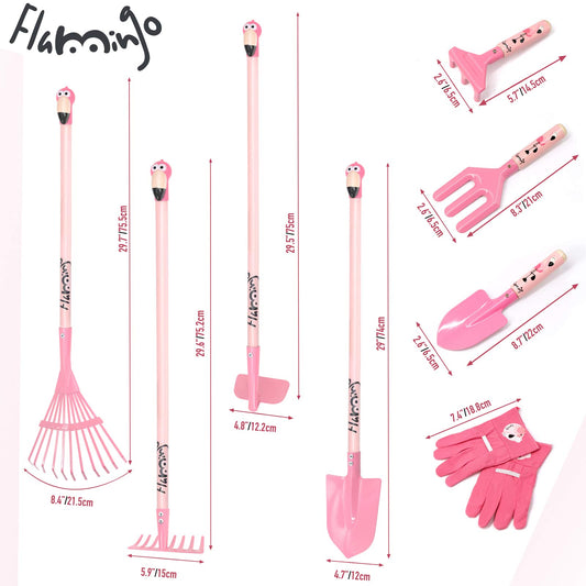 Hortem Las herramientas de jardinería para niños incluyen herramientas largas de metal con cabeza 3D de flamenco, pala, guante de jardín para niños, regalos de jardinería de Halloween para niños