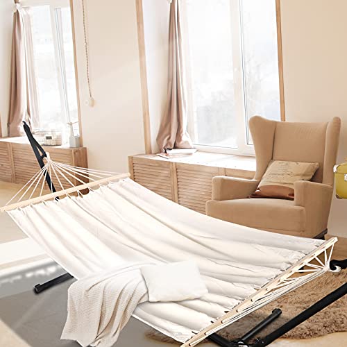 - Grande pero portátil: la hamaca es extra larga, la cama de la hamaca mide 210 cm (L) * 160 cm (W), con una longitud total de 270 cm, peso total: 2,75 kg. Longitud de la barra esparcidora: 120 cm. La hamaca viene con una bolsa de transporte gratuita para facilitar el viaje. Se pliega en un tamaño compacto y viene con su propia bolsa con cordón, por lo que puede colocarlo en su espalda como mochila y llevarlo a donde quiera.