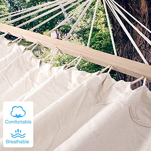 - Más seguro y más fuerte: hecho de tela de algodón de alta densidad, es lo suficientemente fuerte como para contener hasta 200 kg. Las 22 cuerdas de algodón unen las sólidas barras separadoras para brindar una protección superior y más seguridad durante su oasis al aire libre. No solo ofrecen un tacto suave, sino una durabilidad superior en exteriores.