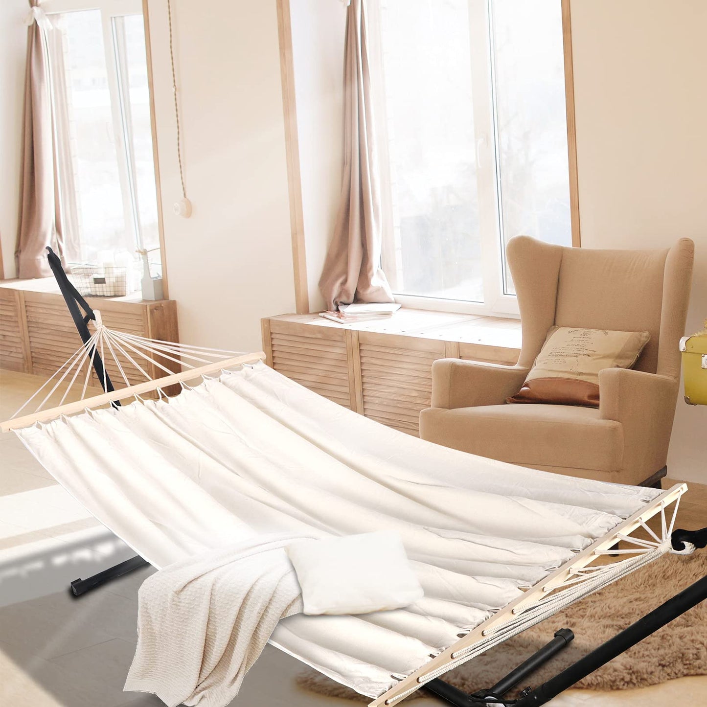 - Mantenga la tela tensa: Las hamacas con barra esparcidora se consideran estéticamente agradables gracias a la barra esparcidora de madera que mantiene tensada toda la tela de las hamacas. Ciertamente se ven más atractivos cuando se cuelgan en el jardín vacío. Dado que la tela está bien extendida, le ofrecen una vista clara de su entorno una vez que se encuentra en ellas.