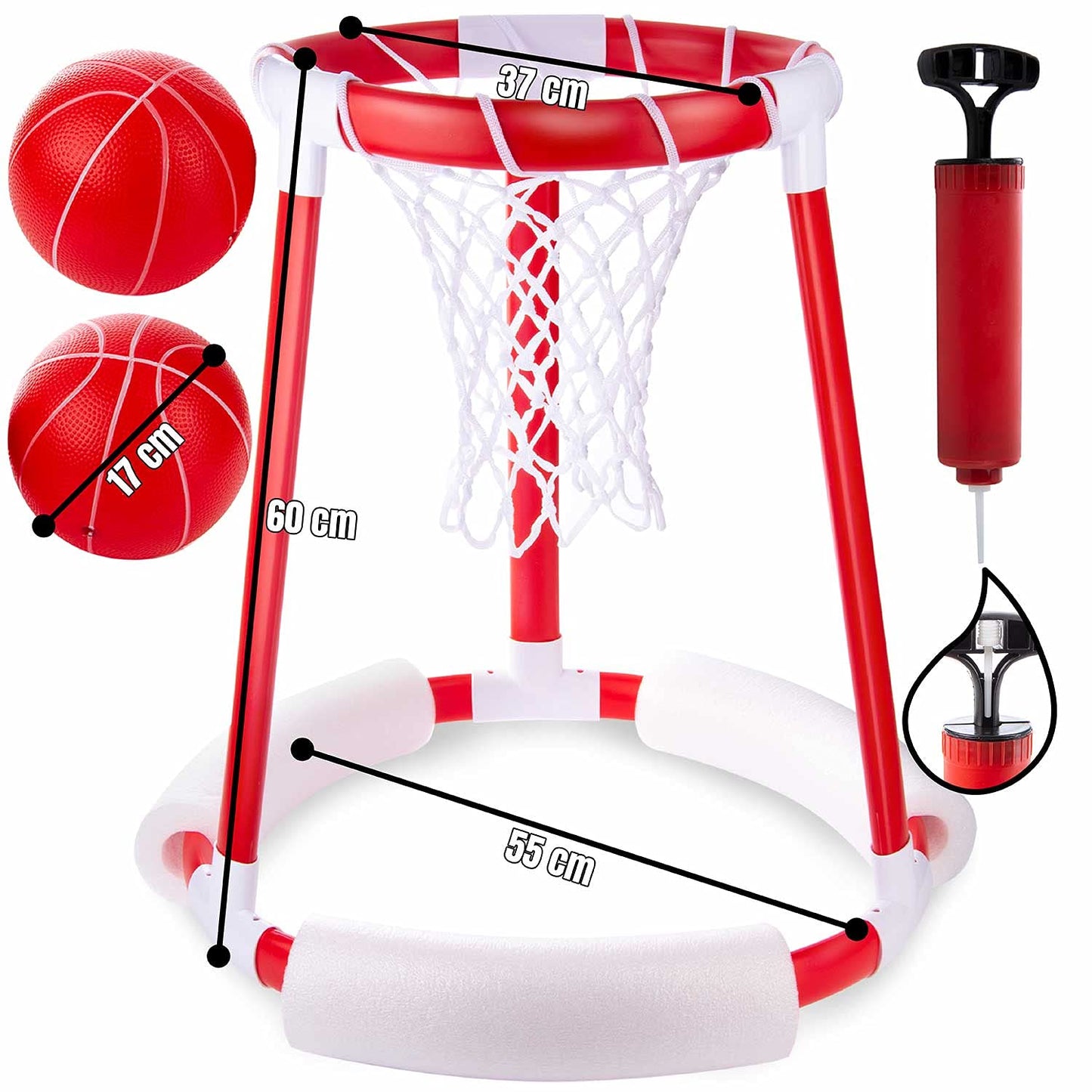 - 🤽 𝗧𝗢𝗗𝗢 𝗟𝗢 𝗤𝗨𝗘 𝗦𝗘 𝗜𝗡𝗖𝗟𝗨𝗬𝗘 𝗘𝗡 𝗘𝗟 𝗦𝗘 - Este juego de piscina contiene todo lo necesario para convertir la piscina en una brillante cancha de baloncesto al aire libre: 1 canasta de baloncesto flotante (Floating Hoop), 2 balones de baloncesto flotantes con agarre antideslizante y una bomba manual de primera calidad. La cesta flota automáticamente en posición vertical, lo que la convierte en el juguete acuático perfecto para cualquier piscina.