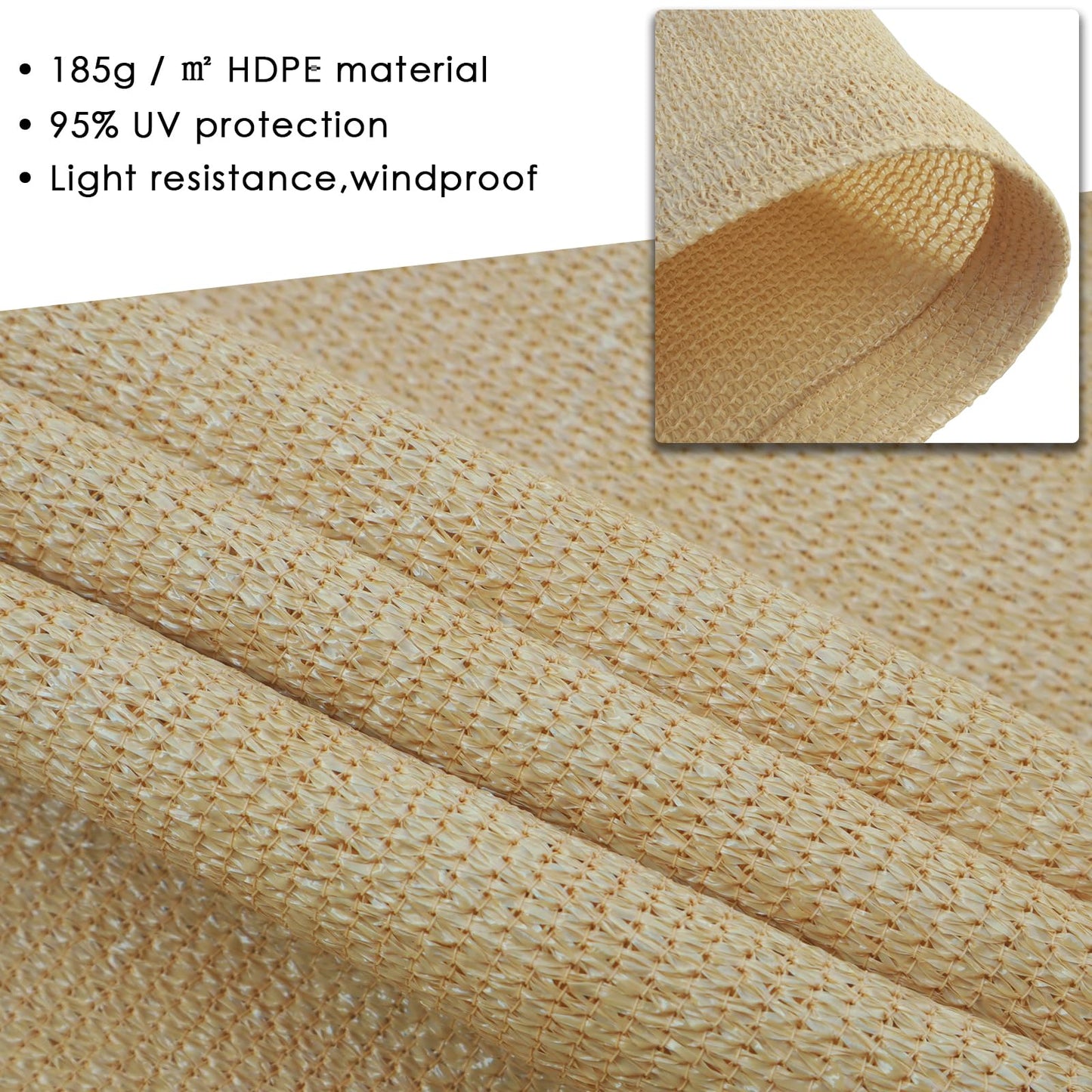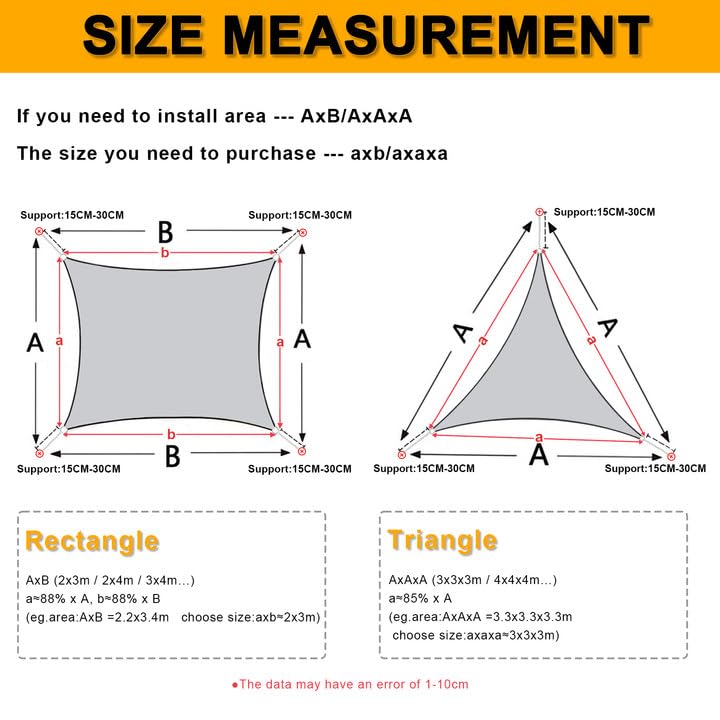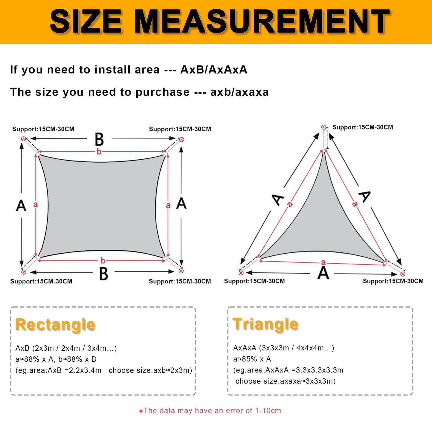 - ★【Fácil de Instalar】: La medición se toma del anillo D al anillo D. Deje un espacio de 15-30 cm entre el punto de fijación y la lona sombra exterior para hardware o cuerda. La costura del sombreadora apunta al suelo