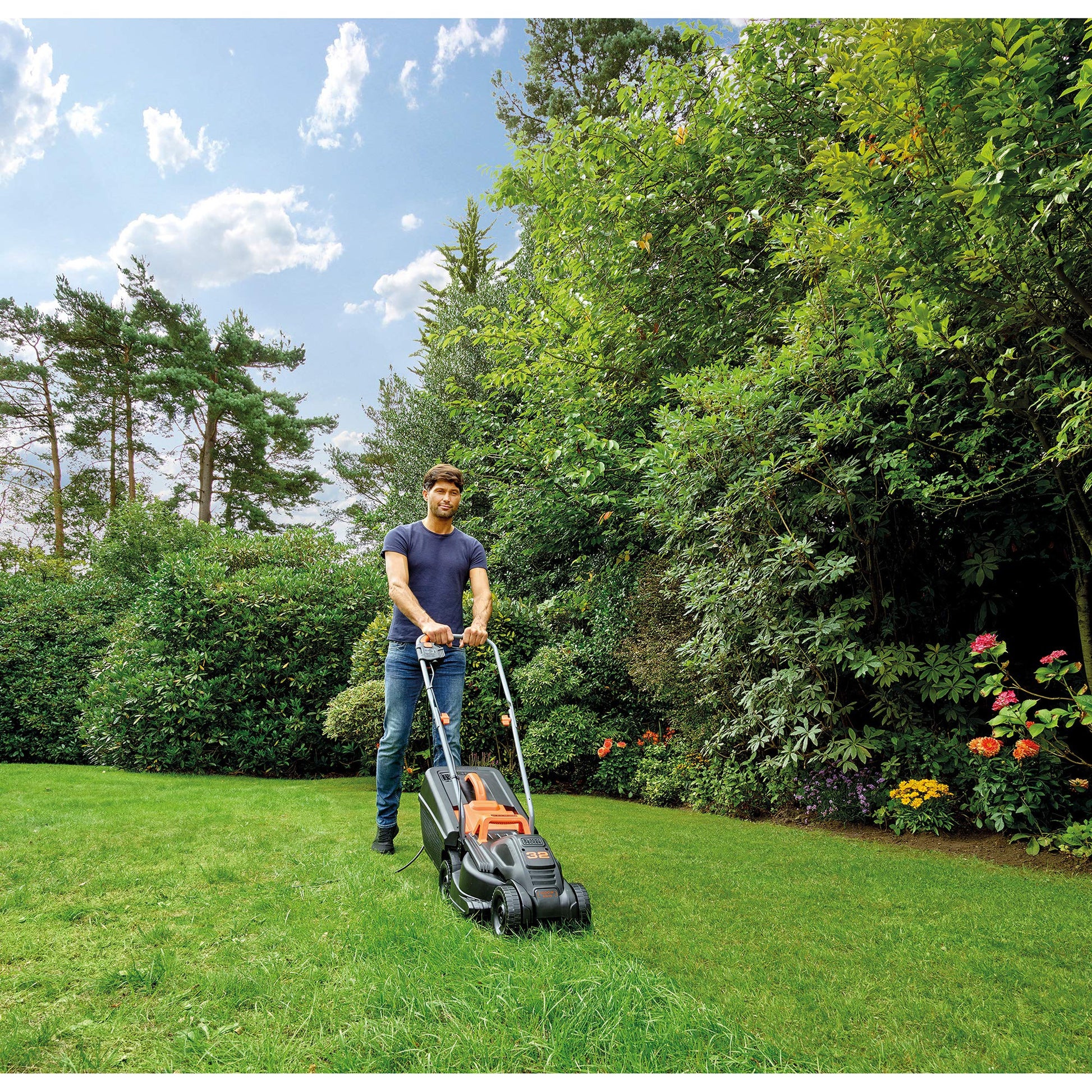 BLACK+DECKER Cortacésped eléctrico 1000W, ancho de corte 32 cm, ajuste de altura de 20-60mm, depósito de 35L, incluye desbrozadora 250W, sistema E-Drive, para jardines hasta 250m², BEMW351GL2