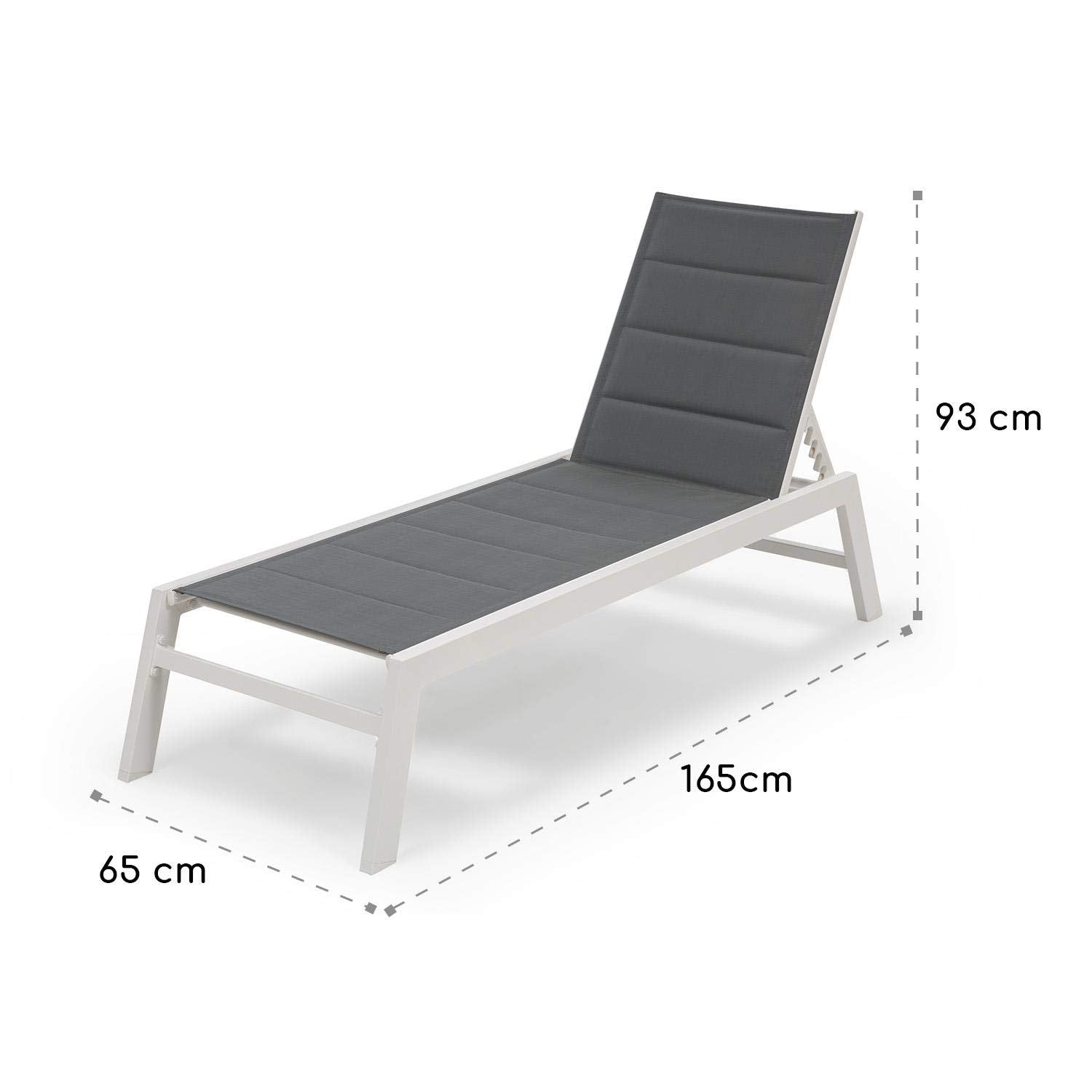 Detalles: Sentado o acostado: cómoda tumbona con respaldo de seis posiciones para tomar el solcómodamente en el jardín, el balcón o la terraza.Resistente a la intemperie, ultraligero e indestructible: estructura de metal robustade aluminio tubular con recubrimiento pulvimetalúrgico y solo 8 kg de peso total.Características:No solo para los amantes del sol: tumbona para relajarse en el jardín, el balcón ola terraza Acostado o sentado: relax individual con respaldo de 6 posiciones regulablesinclusive completamente plano Suave y resistente: impermeable, revestimiento de 1,3 cm de espesor de 70 % de PVCy 30 % de polietileno Tu propio estilo: tumbona disponible en dos combinaciones de colores, antracita yblanco/gris Transpirable: recubrimiento transpirable ComfortMesh fácil de limpiar Indestructible y súper ligero: marco con recubrimiento pulvimetalúrgico resistentea la intemperie de aluminio tubular y un peso total de 8 kgDatos técnicos: Todas las piezas metálicas tienen recubrimiento pulvimetalúrgico a prueba de óxidoo moho El respaldo se puede reclinar completamente para un área de descanso máxima de 186x 56 cm Asiento y respaldo mullidos con tapicería de 1,3 cm de espesor Fácil de desplazar por su bajo peso de tan solo 8 kg Secado rápido, tejido impermeable ComfortMesh Material del tejido: 550 g / 2x1 / 70 % PVC, 30 % PE Color estructura: blanco Color ComfortMesh: grisEnvío: 1 x tumbona (material de montaje) Instrucciones de uso en alemán (otros idiomas: inglés)Dimensiones: 65 x 93 x 165 cm (ancho x altura x profundidad) Respaldo plano: 65 x 35 x 200 cm (ancho x altura x profundidad) Superficie para sentarse: 56 x 116 cm (ancho x largo) Superficie para inclinarse: 56 x 70 cm (ancho x largo) Peso: 8 kg
