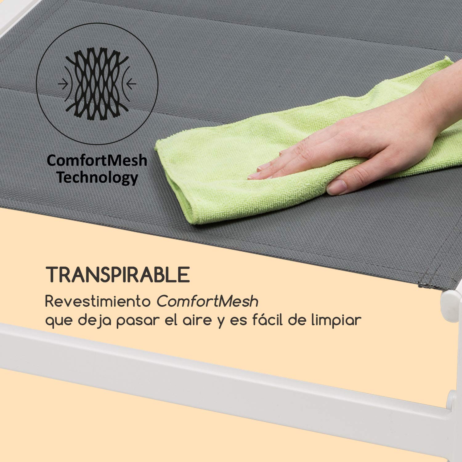 - TREMENDAMENTE ESTABLE: El armazón es muy ligero y está hecho enteramente de aluminio, de modo que la tumbona solo pesa 8 Kg. La parte metálica con revestimiento en polvo aguanta las inclemencias del tiempo y se limpia fácilmente.
