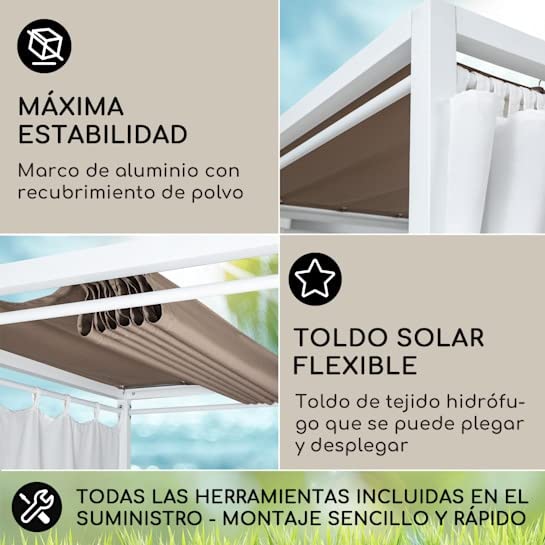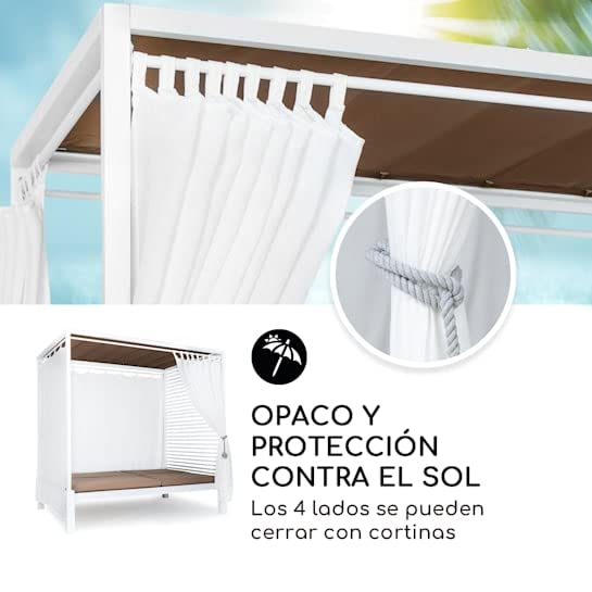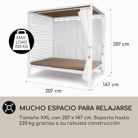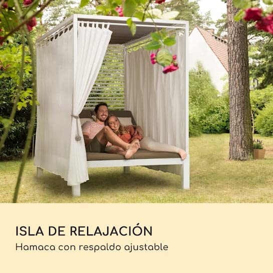 - CAMA SOLAR AJUSTABLE PARA UN CONFORT TOTAL: Deja que el sol caliente tu piel sin quemar tus ojos. Tumbona doble jardin exterior con respaldo ajustable, techo parasol y cortinas. Esta cama jardin exterior te permite leer y echarte la siesta.