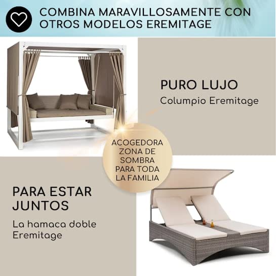- RELAX Y DESCANSO DE LUJO: Disfruta del máximo confort con esta cama balinesa para jardín durante todo el verano. Esta tumbona doble para jardín, piscina o patio ofrece espacio suficiente para que dos personas se relajen juntas con estilo y comodidad.
