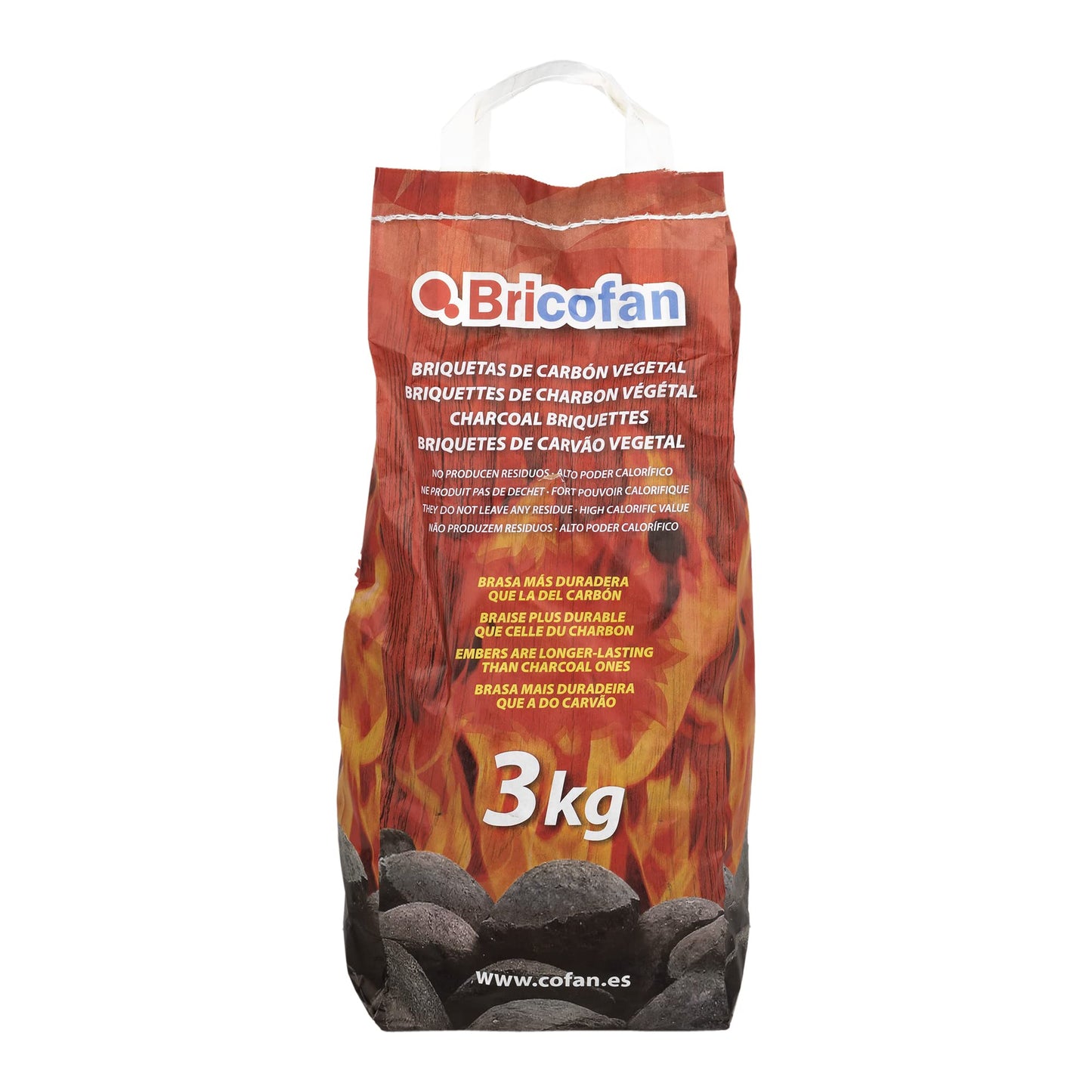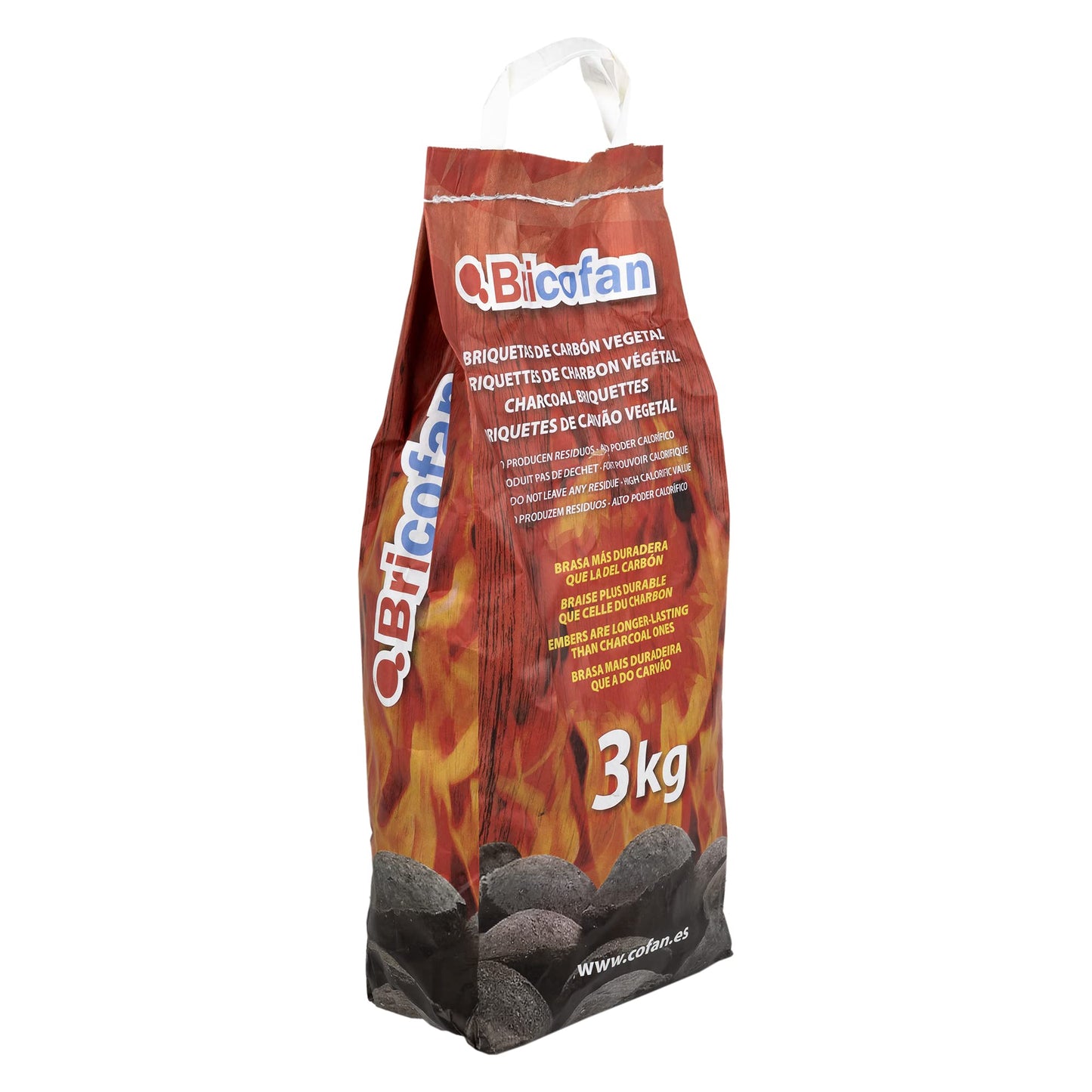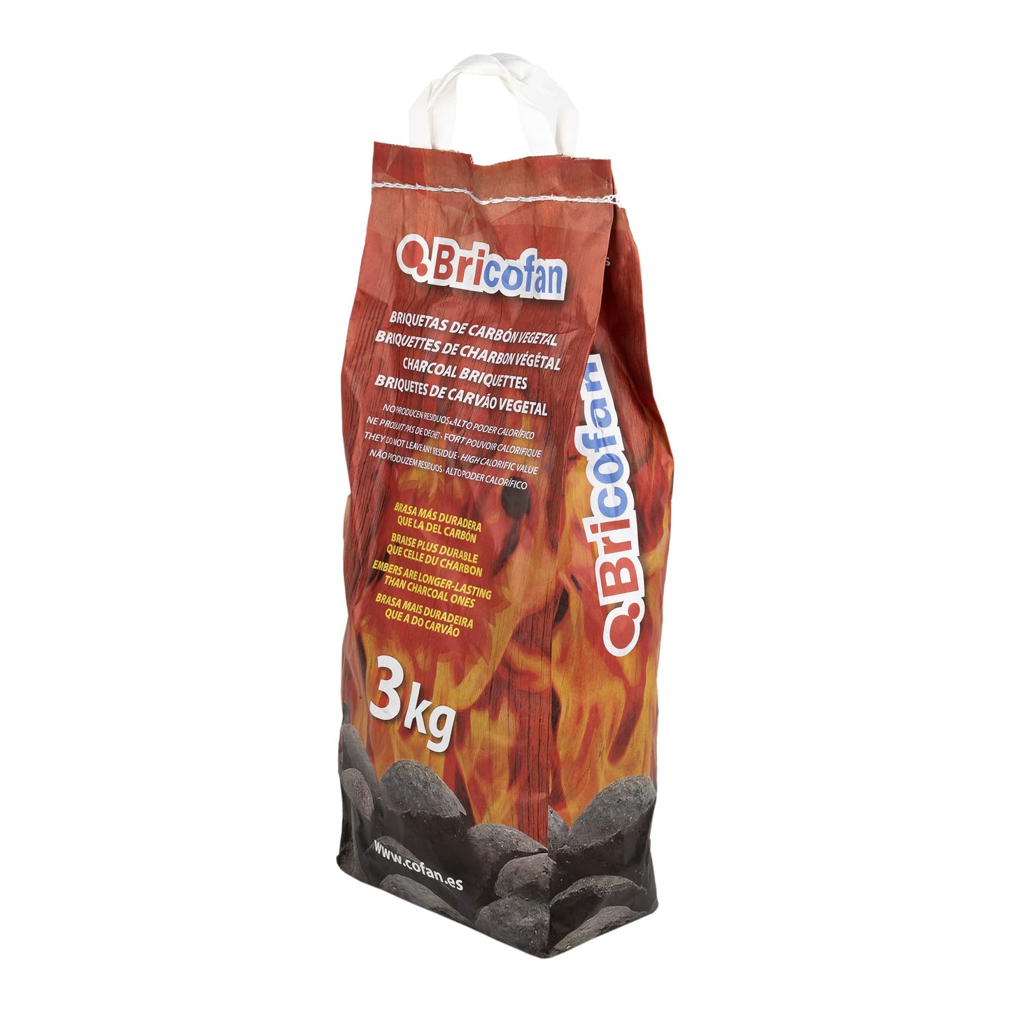 Detalles: Briquetas de carbón vegetal en bolsas de 3 kilos ideales para la realización de brasas en barbacoas, parrillas y asados.