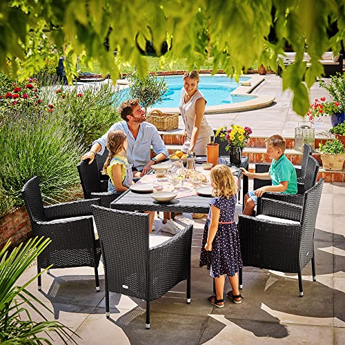 - MUEBLES DE JARDÍN DE ALTA CALIDAD: El conjunto de muebles de exterior cuenta con una mesa y 8 sillas apilables de poliratán. El Set de jardín se destaca por su resistencia a la intemperie y durabilidad. Ideal para el balcón, jardín o terraza.