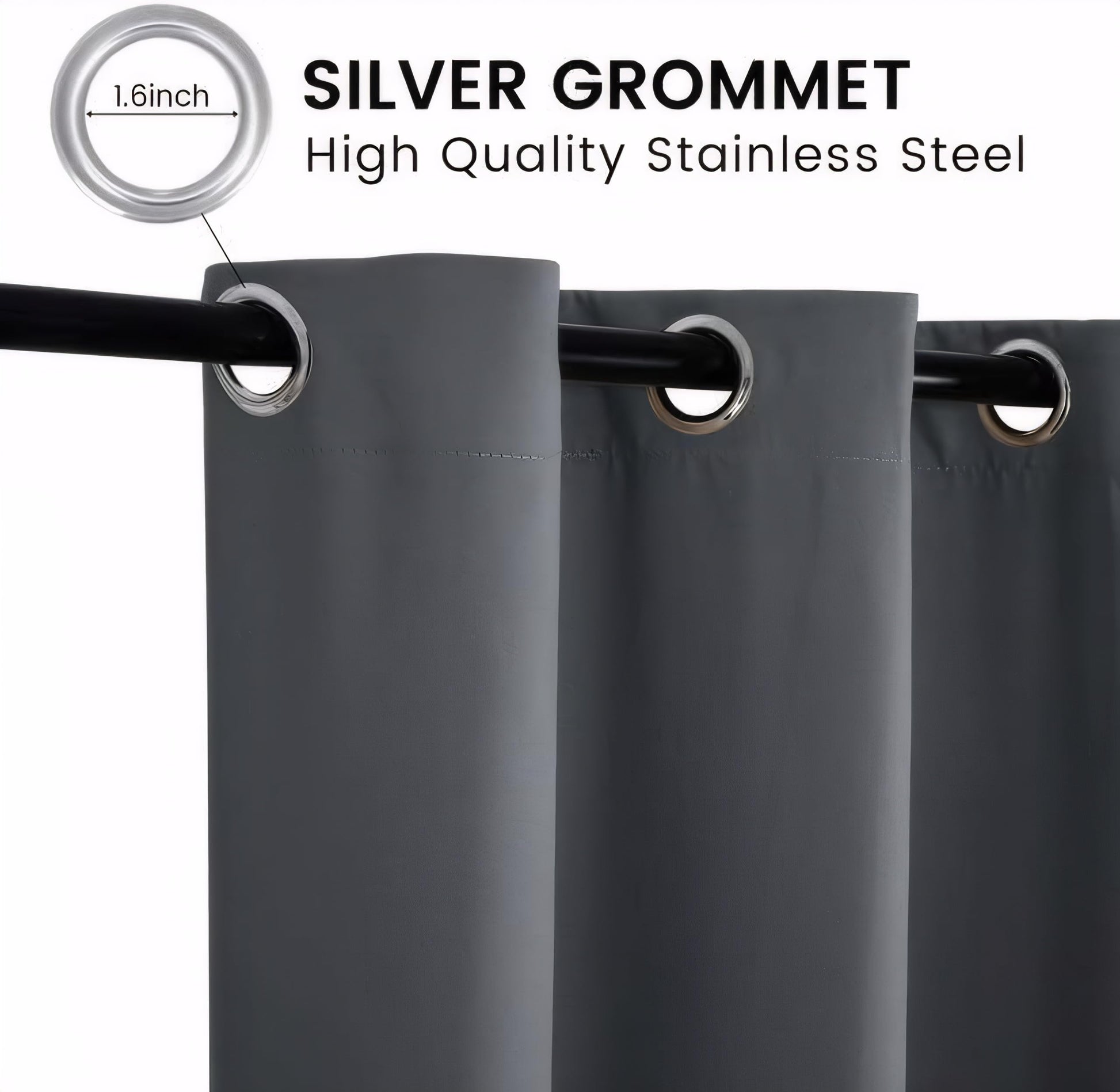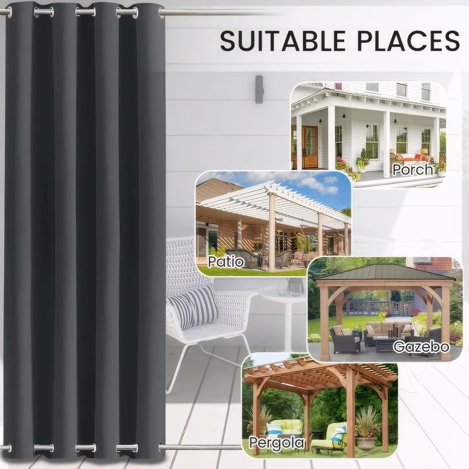 - Perfectas para interiores y exteriores: estas cortinas con aislamiento térmico son la solución perfecta para añadir privacidad y proteger tu terraza, patio, porche o espacio al aire libre de los elementos. Perfecta para pérgolas y cenadores, la cortina sólida para interiores y exteriores está equipada con ojales de acero inoxidable que permiten colgar fácilmente en una barra de cortina estándar de hasta 1.6 pulgadas de diámetro.