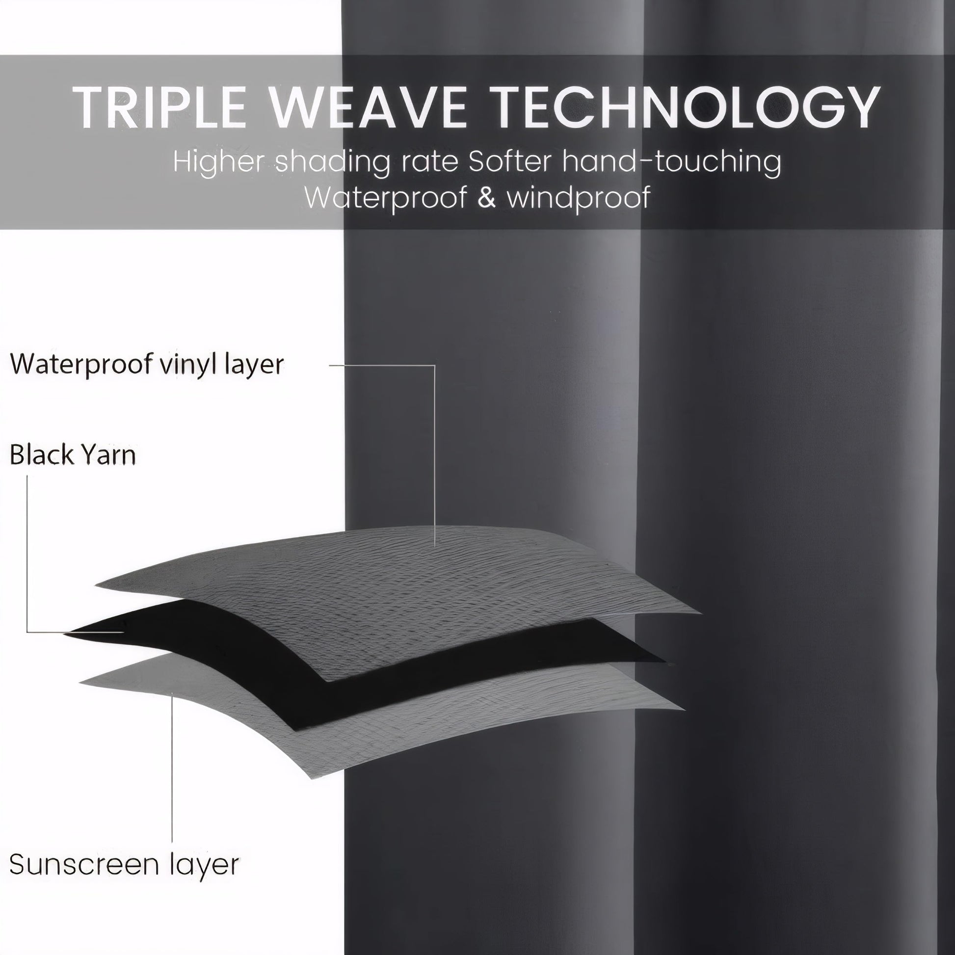 - Bloquean del 85 al 95 % de la luz solar, protegen la privacidad: estas cortinas de poliéster duraderas están hechas con tecnología de triple tejido, que bloquea del 85 al 95 % de la luz solar y el calor. La tela también bloquea el viento y absorbe el agua, por lo que las cortinas son muy eficaces en múltiples condiciones climáticas. El material es lo suficientemente suave como para usar en interiores o en un solárium.