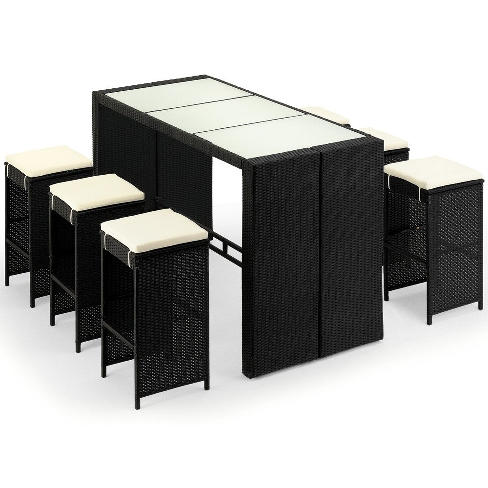 - ☀️ Set de muebles de bar poliratán: 6 Taburetes con cojines de color crema y 1 mesa con placas de vidrio y descansapies.