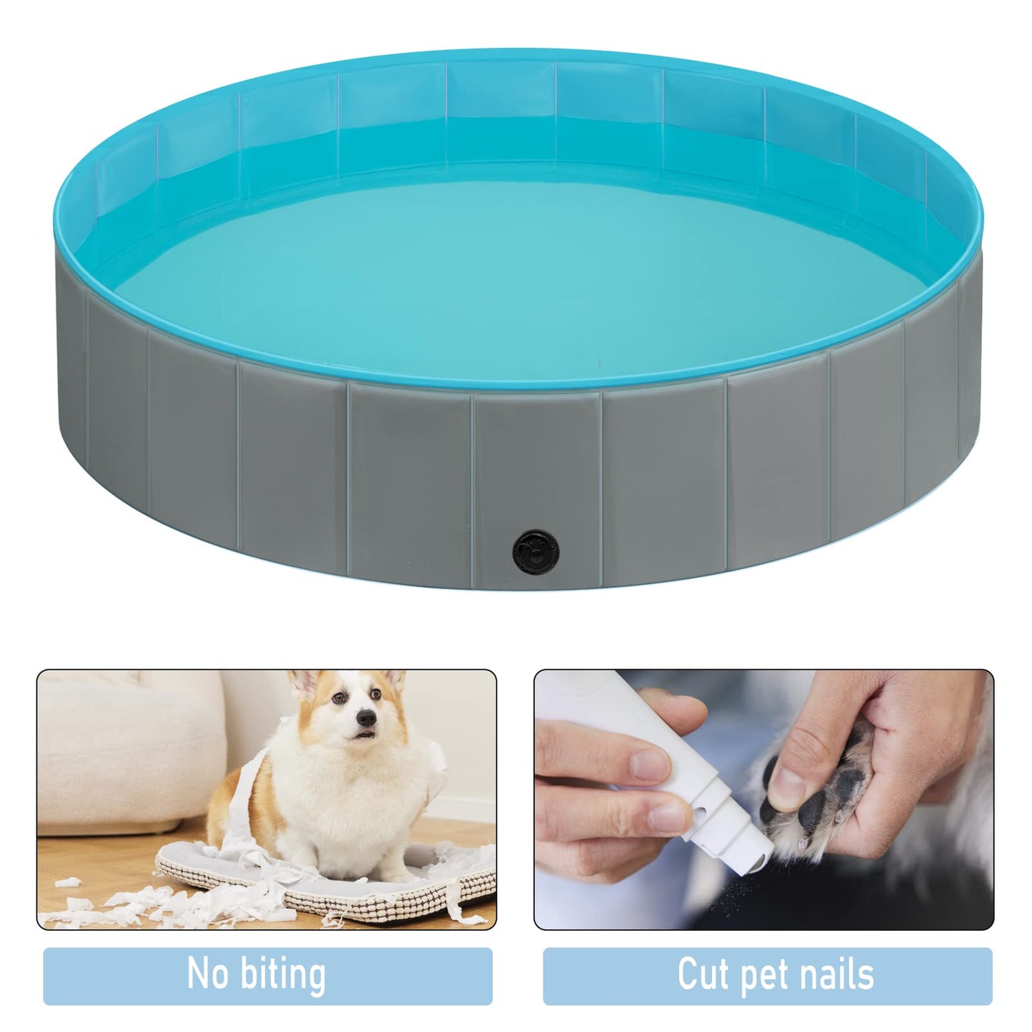 - Antideslizante: el relieve antideslizante dentro de la piscina plegable para perros puede aumentar la fricción, lo que permite que las mascotas jueguen de forma segura en el agua. Nota: corte las uñas del perro antes del uso.