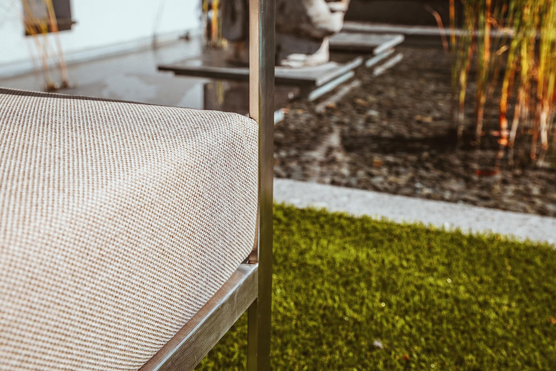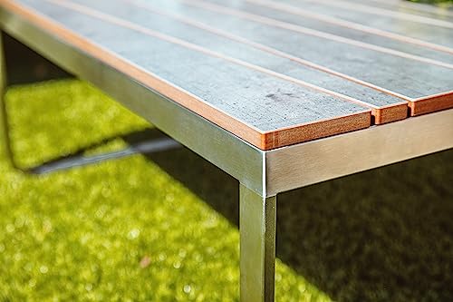 - Marco plateado de acero inoxidable cepillado, atractivo tablero con listones y apoyabrazos de HPL (aminados de alta presión) en antracita, cómodos cojines de 100% poliéster en beige, lavables a 40 °C