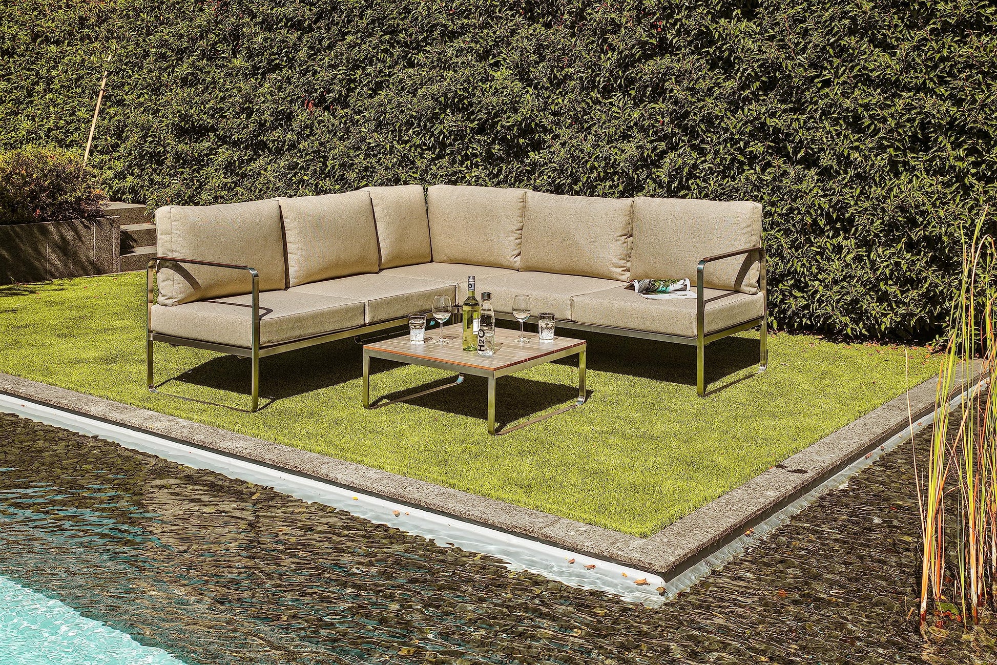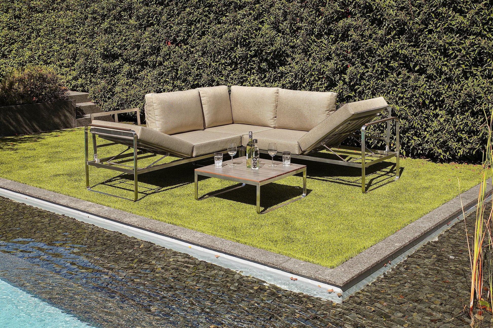 Características principales: marco de acero inoxidable de alta calidad diversas opciones de posicionamiento tablero de mesa con estilo de listones sofás con función de tumbona respaldos extraíbles sofás con función de tumbona cojines de asiento y respaldo cómodos de aprox. 12 cm de grosor (lavables)