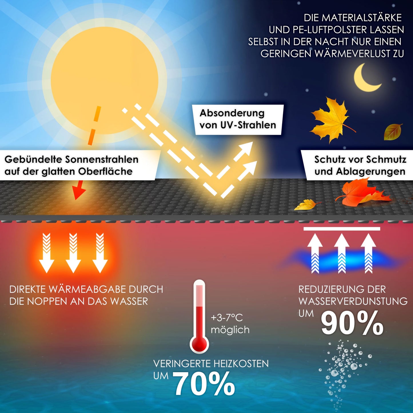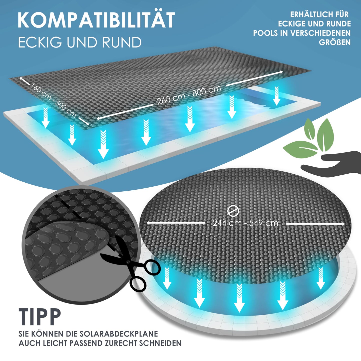- 𝐏𝐑𝐎𝐓𝐄𝐂𝐂𝐈Ó𝐍 𝐈𝐃𝐄𝐀𝐋: nuestra cubierta solar no solo cuida tu billetera y el medio ambiente, también cuida el agua de la suciedad, los insectos, las hojas y otros residuos. La cubierta solar está disponible para piscinas cuadradas y redondas de distintos tamaños. Nuestro consejo de experto: corta la cubierta solar fácil y rápidamente para que se adapte a tu piscina.