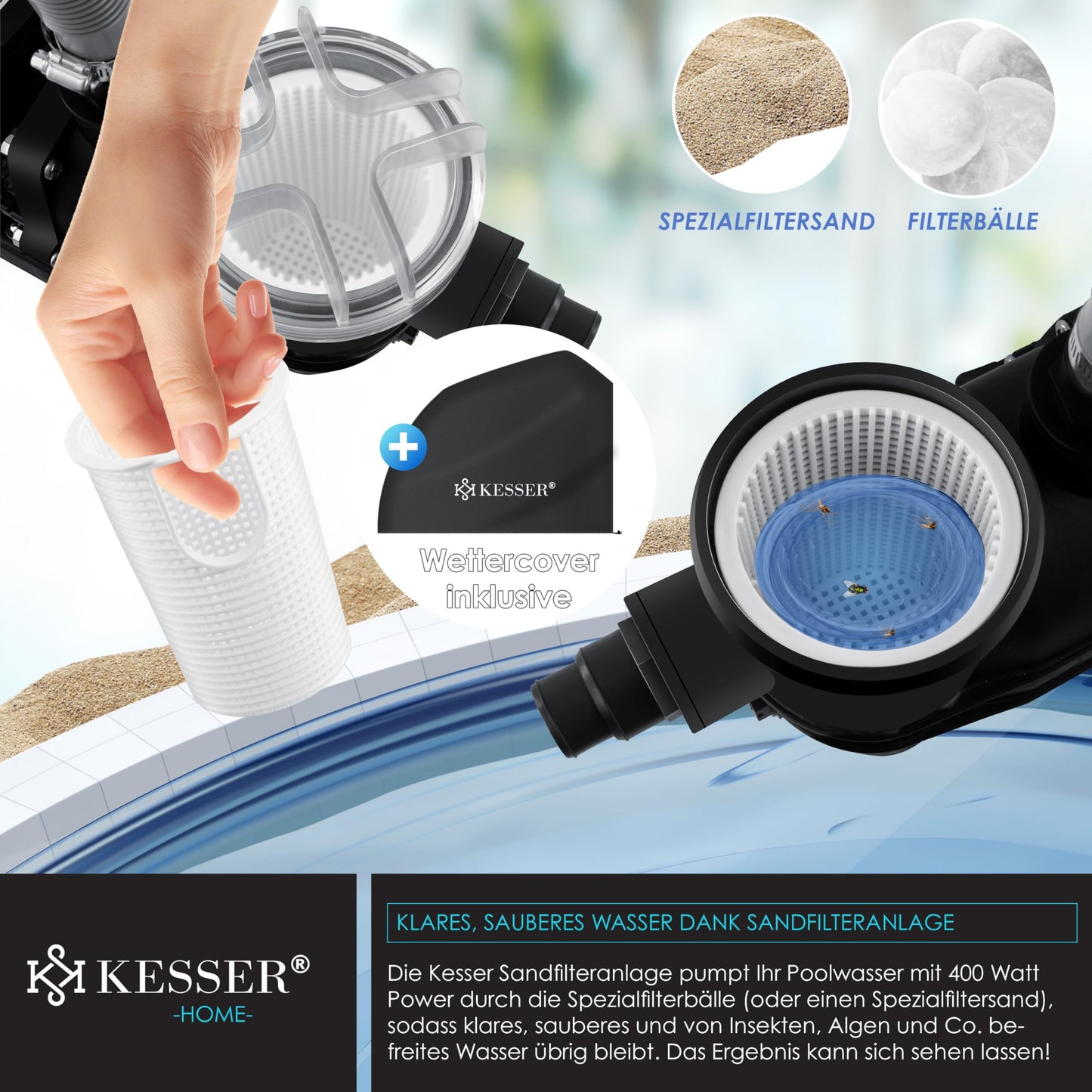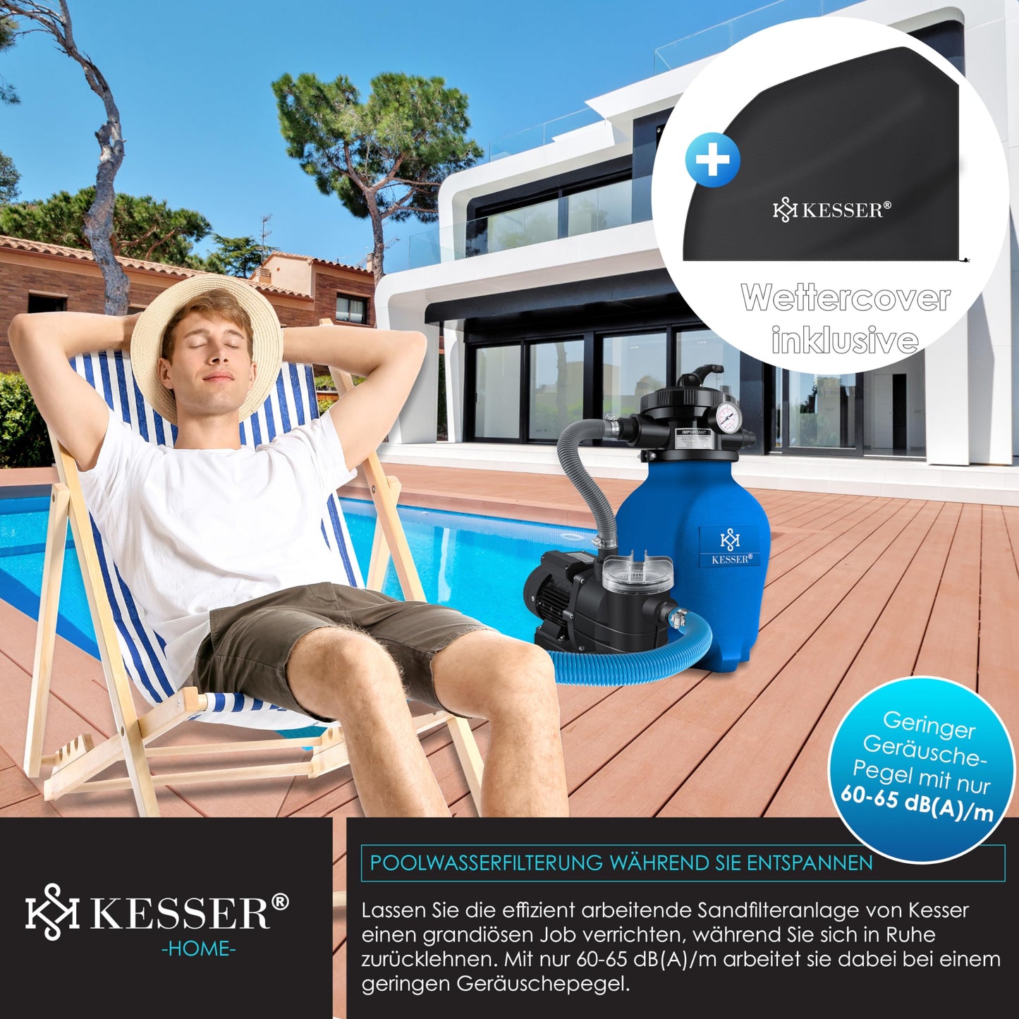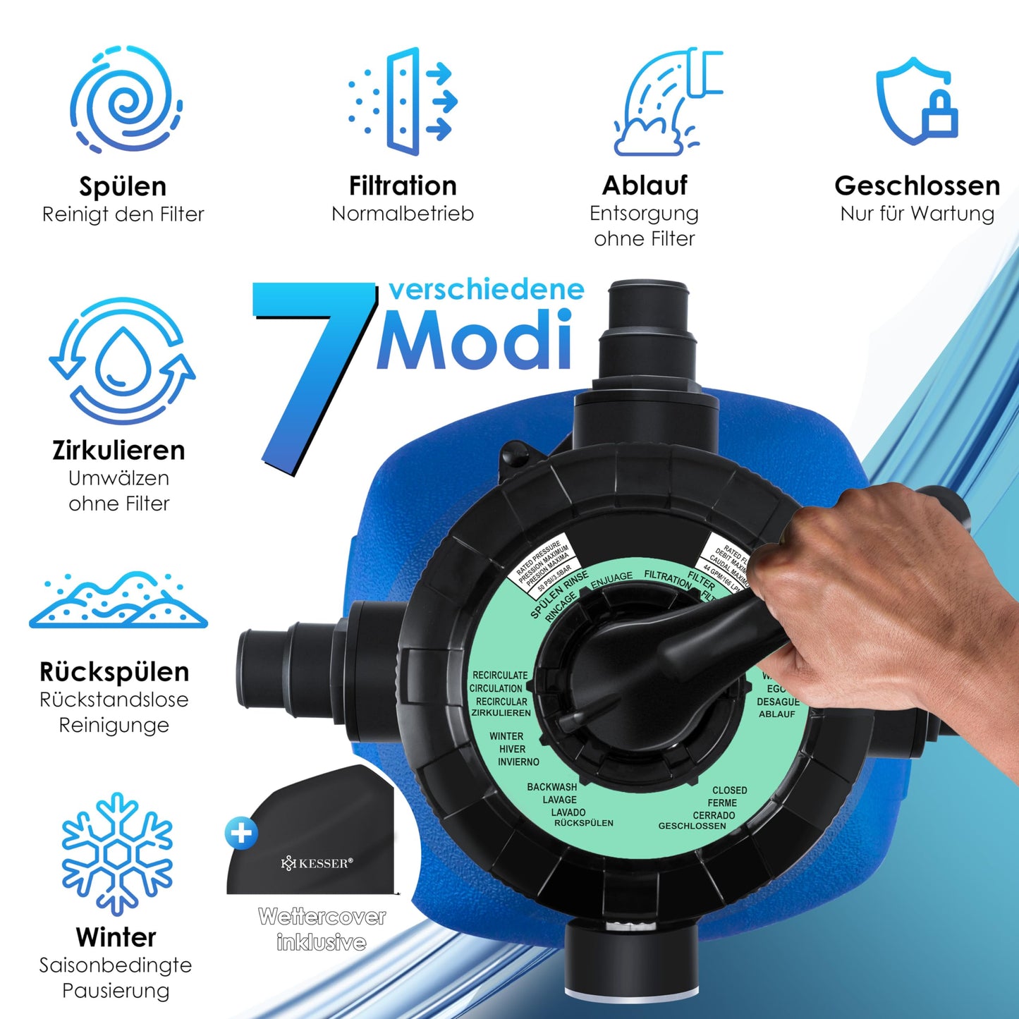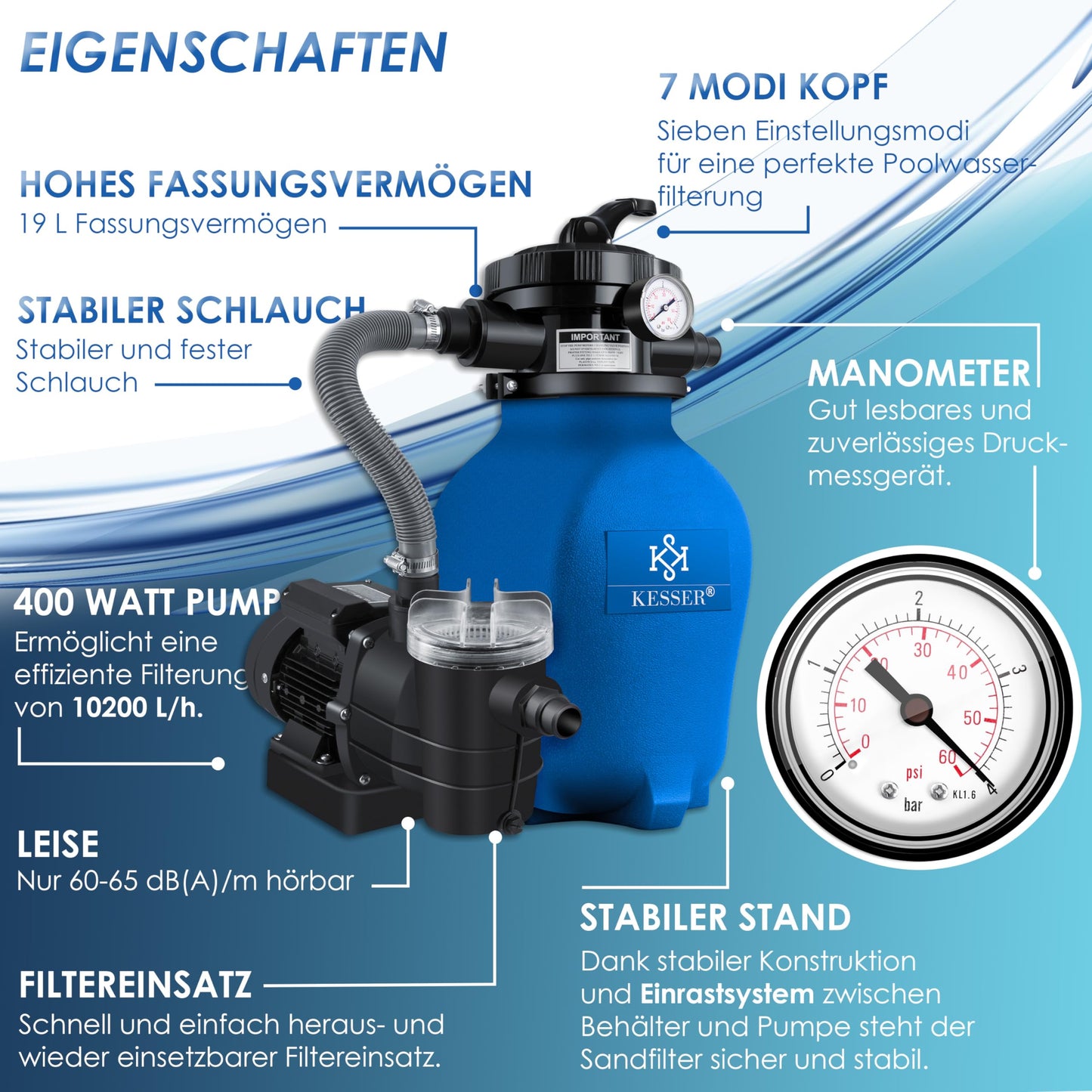 - 𝟕 𝐎𝐏𝐂𝐈𝐎𝐍𝐄𝐒 𝐃𝐄 𝐀𝐉𝐔𝐒𝐓𝐄: Deja que el sistema de filtrado de arena KESSER, que funciona eficazmente, haga un excelente trabajo, y así te sentirás tranquilo. Con solo 60-65 dB(A)/m, el sistema de filtrado funciona con un bajo nivel de ruido. Benefíciate de una filtración profesional del agua de piscina con el potente sistema de filtrado de arena.