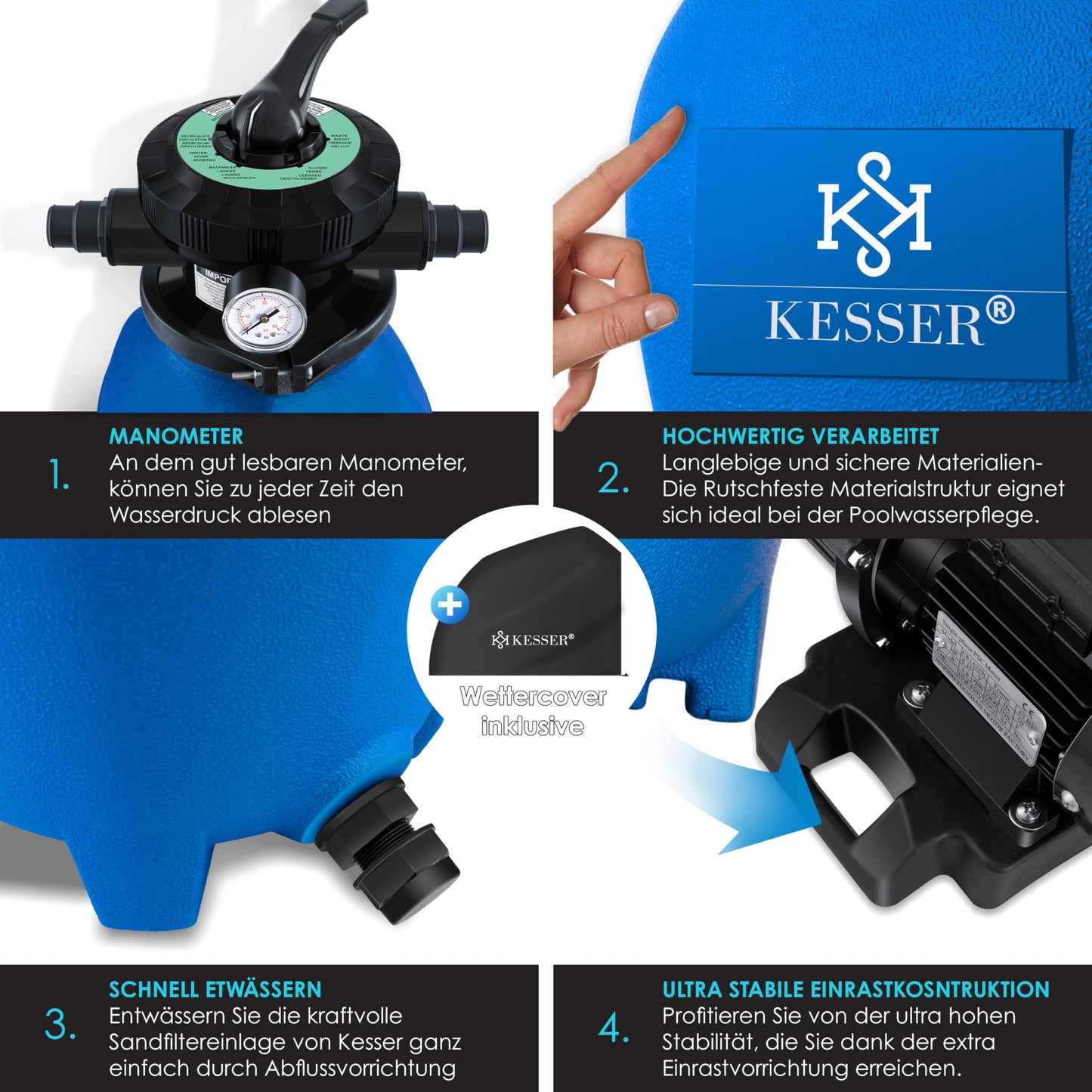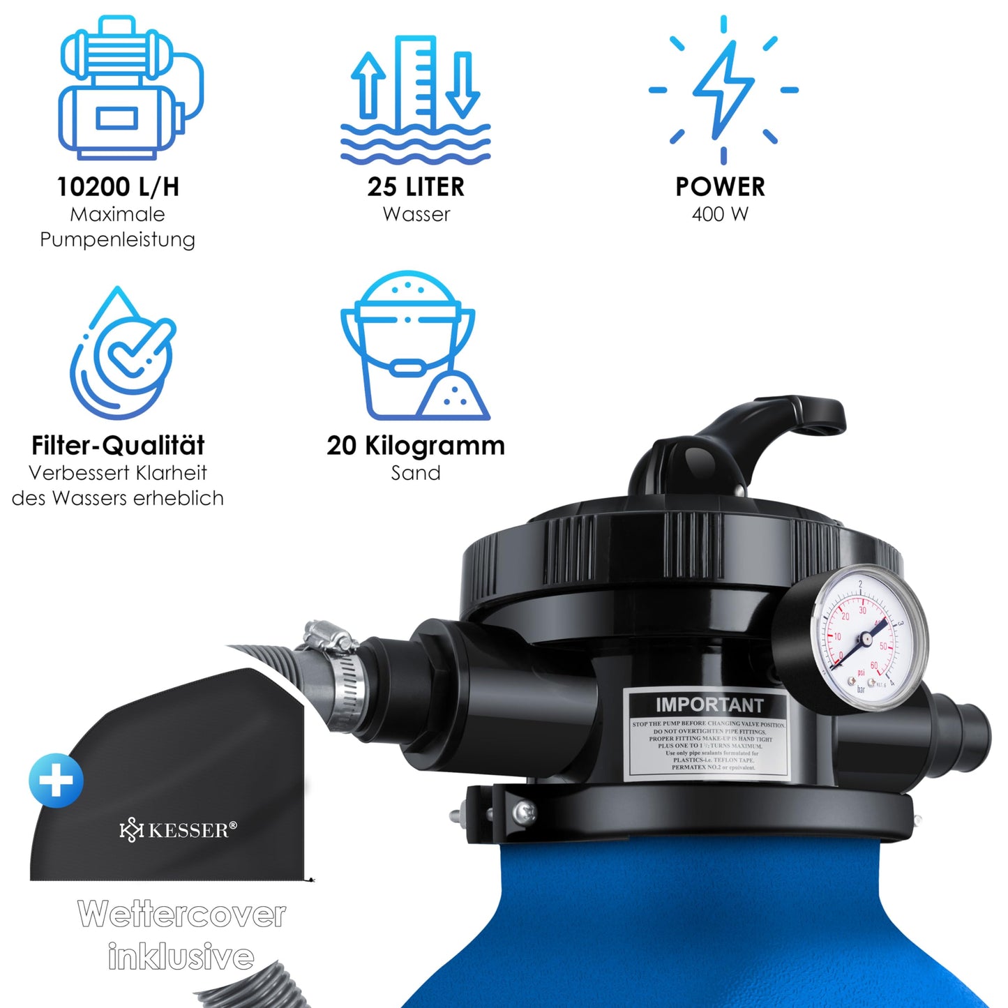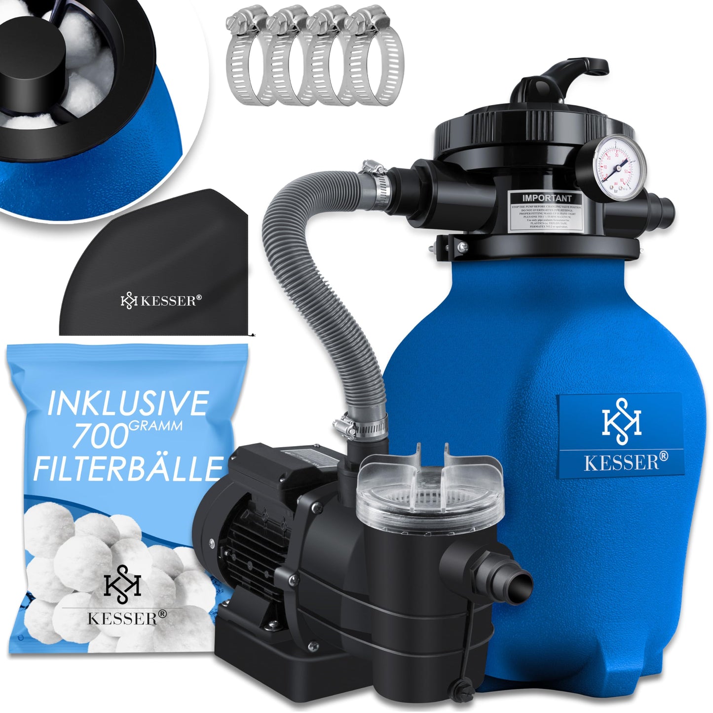 KESSER® Sistema de filtración de Arena Filtro de Arena + 700 g de Bolas de filtración reemplazan 25 kg de Arena de filtración válvula de 4 vías con indicador de presión Filtro de Piscina, Azul