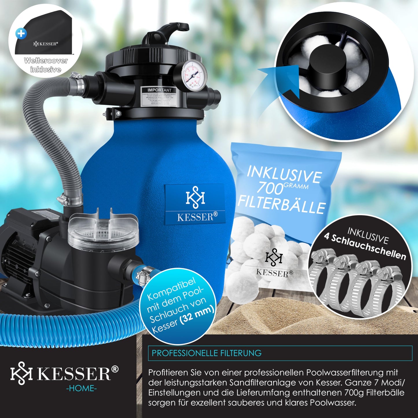 • Compatibilidad con mangueras: 32 mm (compatible con la manguera de piscina KESSER)