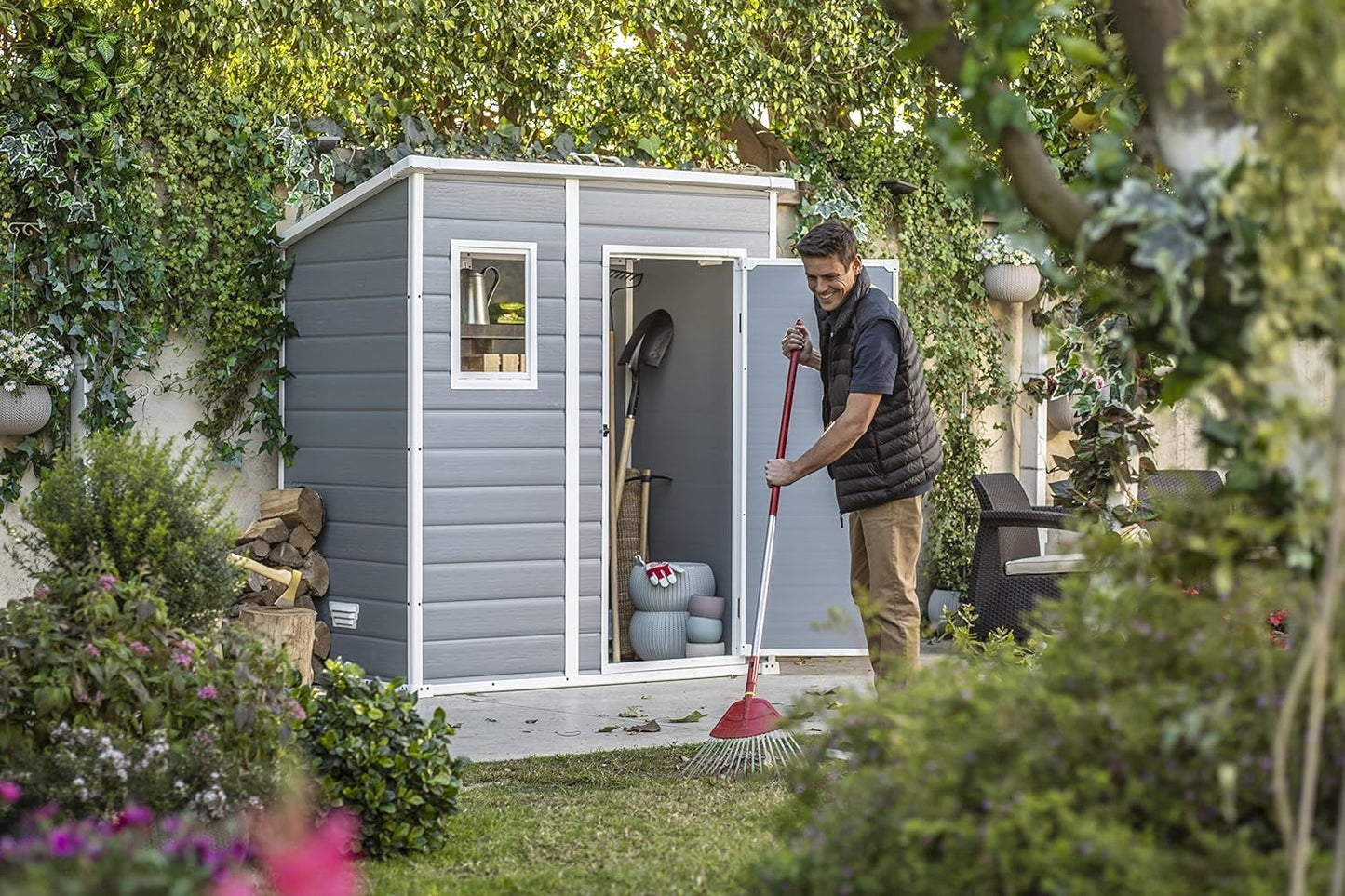 Keter Manor Pent 4X6 - Caseta de jardín, 183,5x111x200,5 cm y 1,8m2, Suelo, Sistema de ventilación, Puerta y Ventana, Resistente al Agua, Color Gris