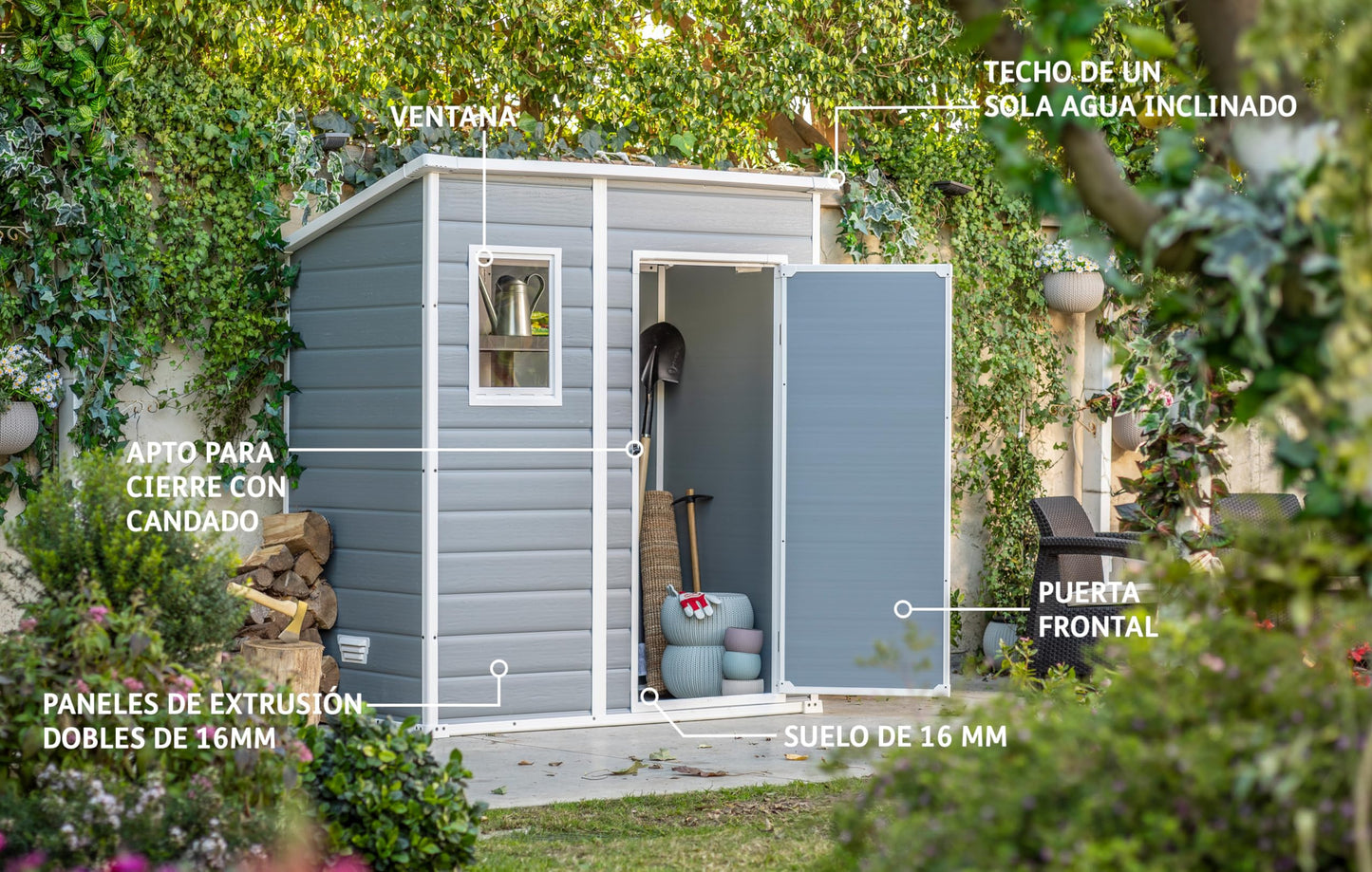 - Caseta de exterior e interior para almacenar todas las herramientas y utensilios de hogar y jardín.