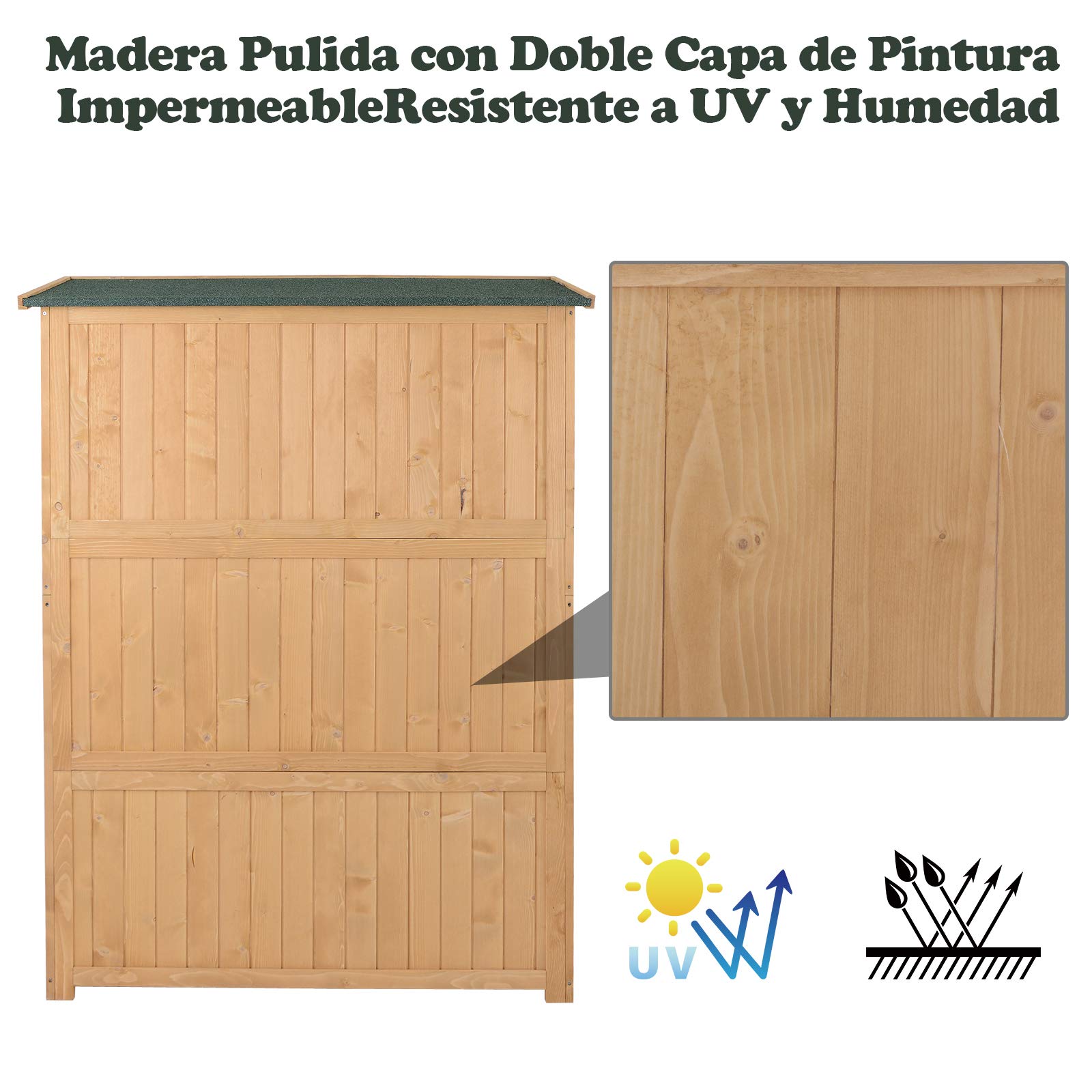 - RESISTENTE: Cobertizo hecho de madera de abeto natural resistente. Con 4 patas que mantienen la base elevada del contacto directo con el suelo previniendo la humedad. Cuenta con cierre magnético