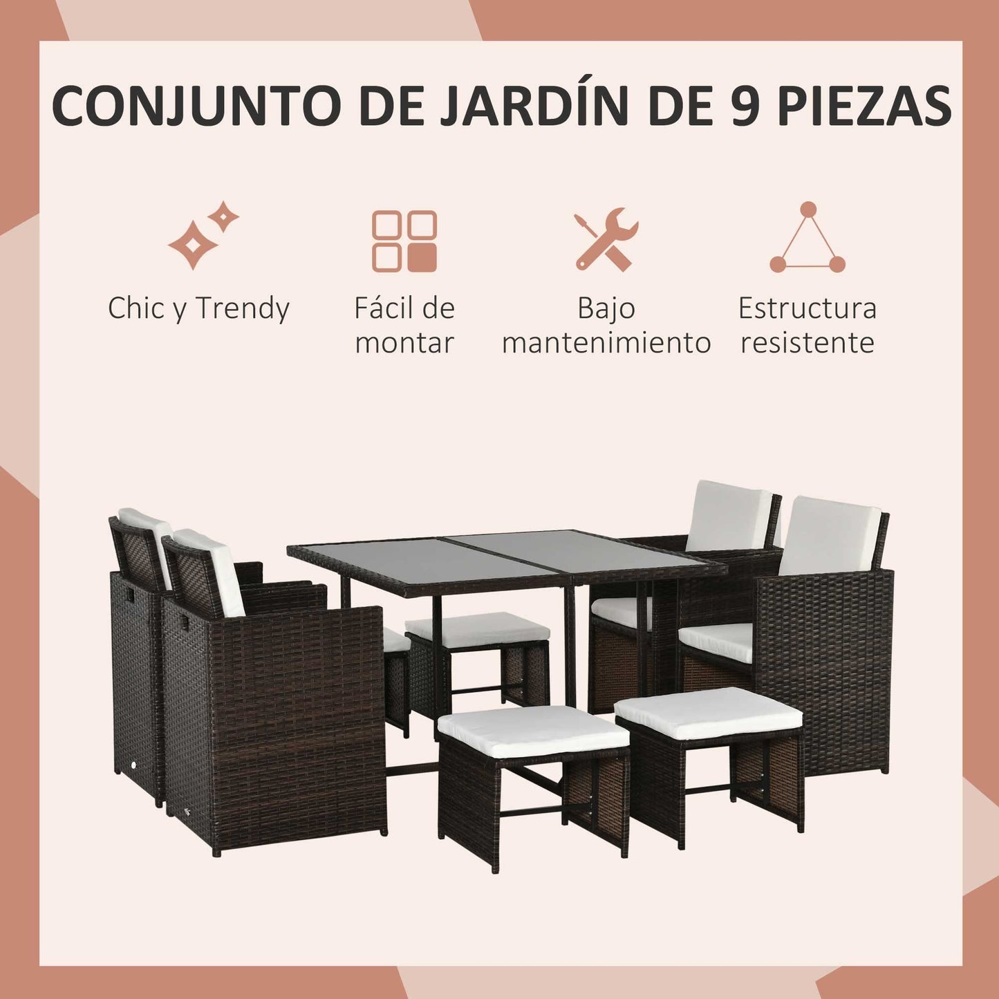 Outsunny Conjunto de Muebles de Jardín Comedor 9 Piezas de Ratán Apilables con Cojines para Terraza 1 Mesa 4 Sillas y 4 Taburetes de Exterior Elegante Marrón