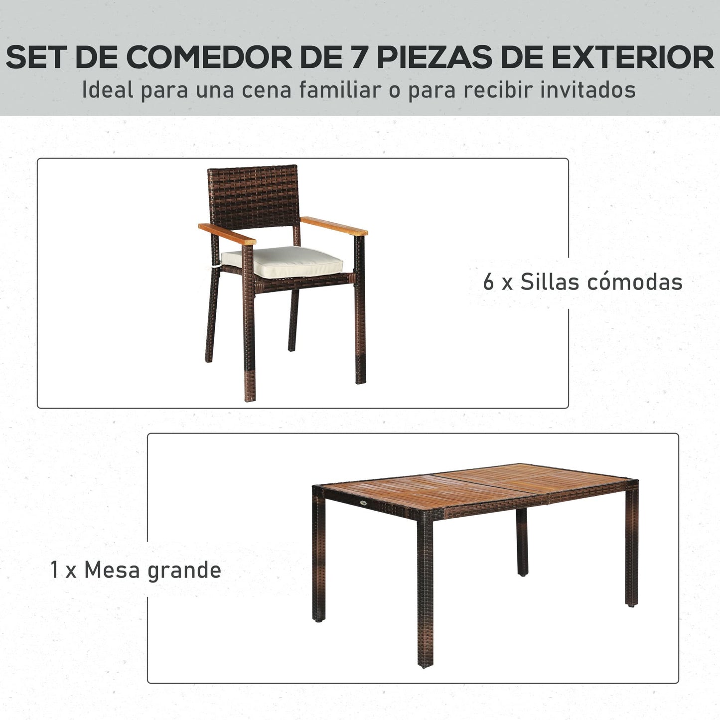 Outsunny Conjunto Muebles de Ratán Sintético para Jardín 7 Piezas Juego de Comedor de Mimbre para Exteriores con 6 Sillas con Cojines y Mesa 150x90x74 cm y 50x55x88 cm Marrón