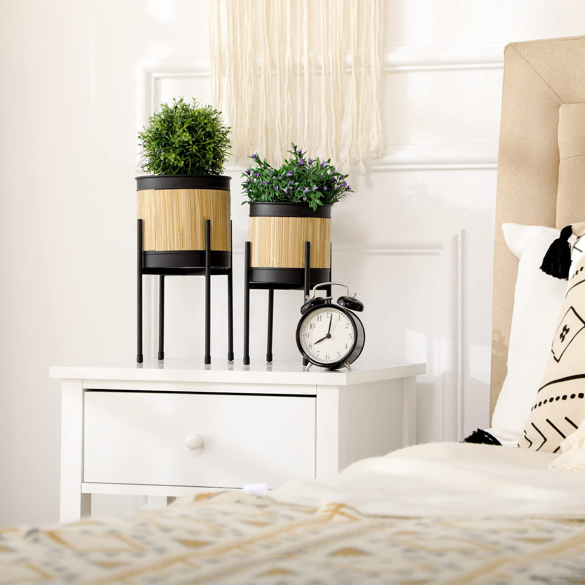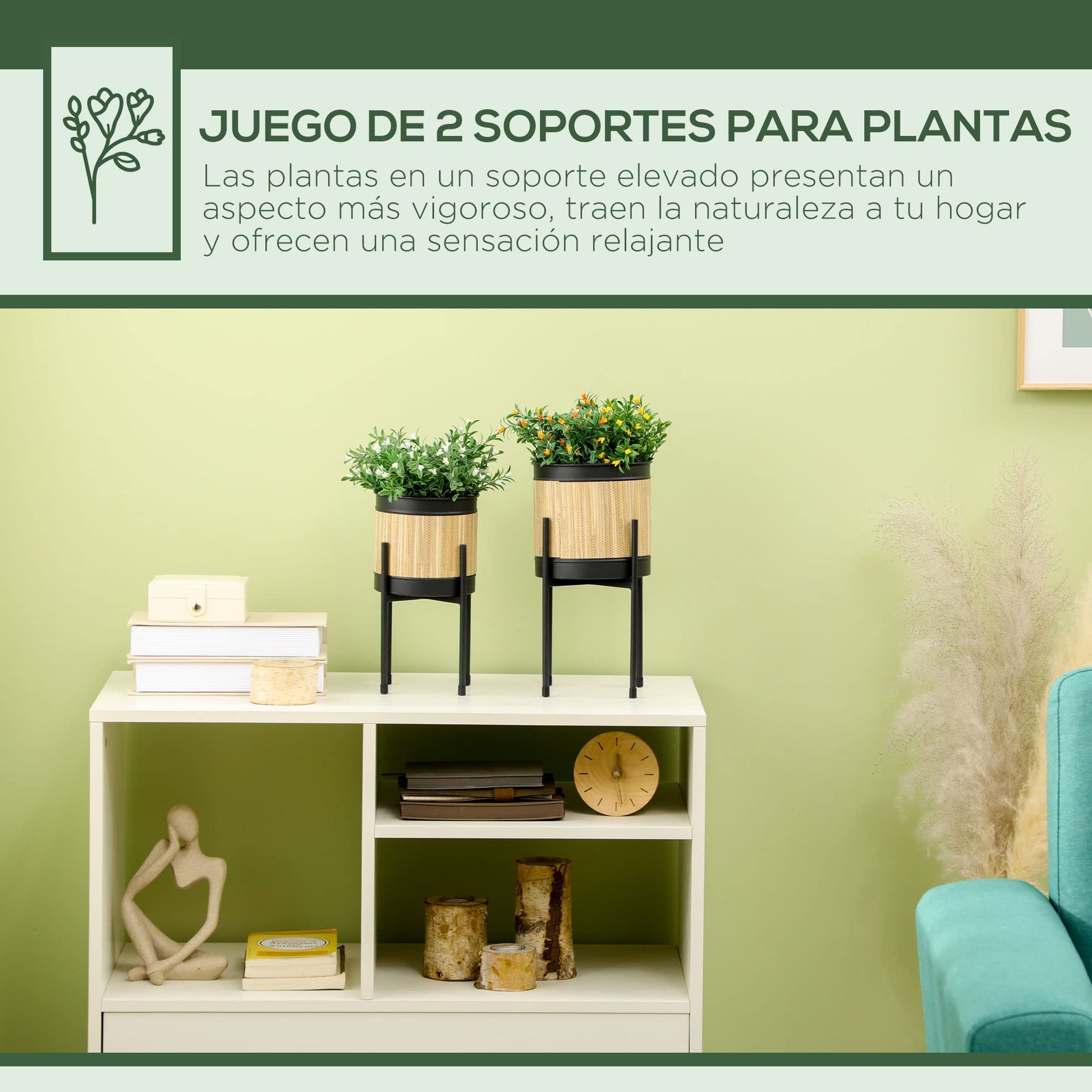 Outsunny Juego de 2 Soportes para Plantas de Metal Cubierta de Totora Soportes para Macetas Maceteros Redondos para Salón Cocina Dormitorio Ø16x30 cm y Ø14x25,5 cm Negro