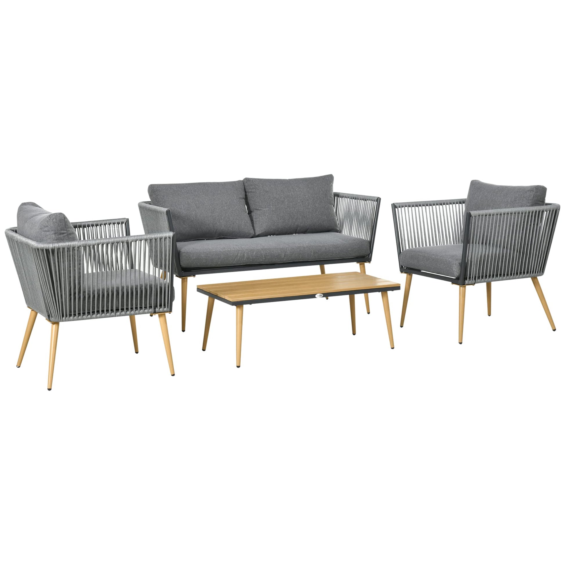 Outsunny Juego de Muebles de Jardín de Ratán 4 Piezas Juego de Conversación Incluye Sofá de 2 Plazas 2 Sillones y Mesa de Centro de Tablero de Madera y Plástico Cojines para Terraza Patio Gris