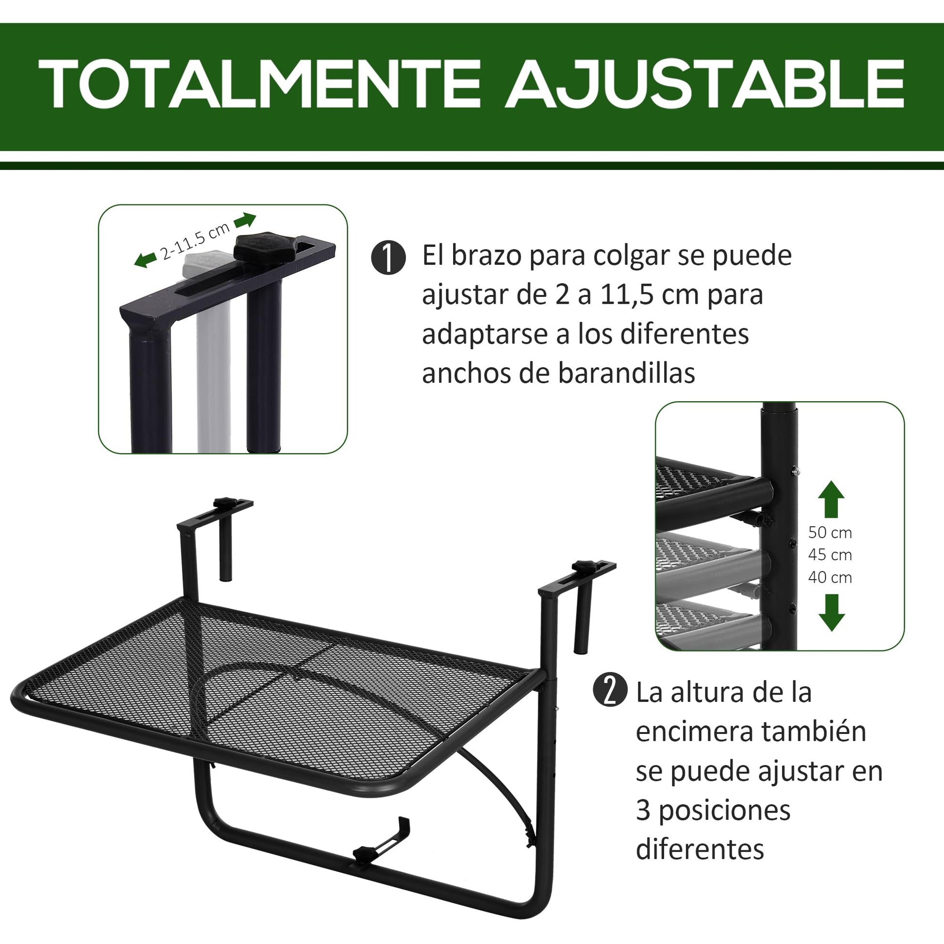 - TOTALMENTE AJUSTABLE: El brazo suspendido puede ajustarse de 2 a 11,5 cm para acomodar diferentes anchuras de barandillas. La altura de la mesa también puede ajustarse entre 40 y 50 cm para satisfacer tus diferentes necesidades