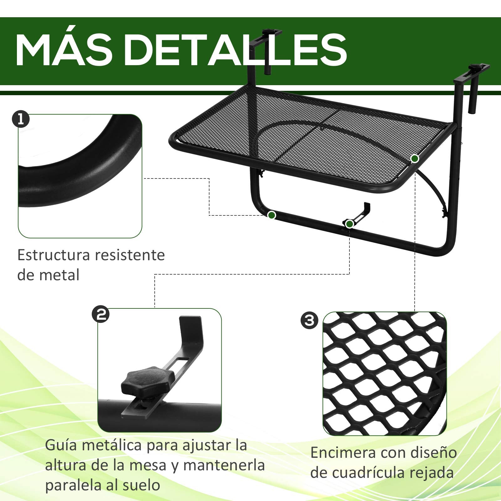 - ESTRUCTURA RESISTENTE: Esta mesa plegable para balcón rectangular está hecha de metal resistente, revestida en polvo para mayor resistencia a las inclemencias del tiempo y a la corrosión