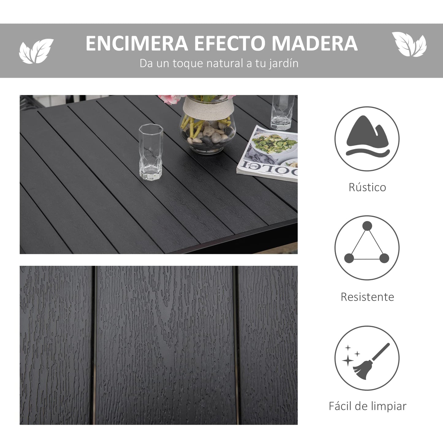 - ENCIMERA IMITACIÓN MADERA: Las lamas de plástico de la encimera de esta mesa terraza tienen una textura que reproduce la de la madera. Resistentes, fáciles de limpiar y de secado rápido, son resistentes y aptas para uso en exteriores
