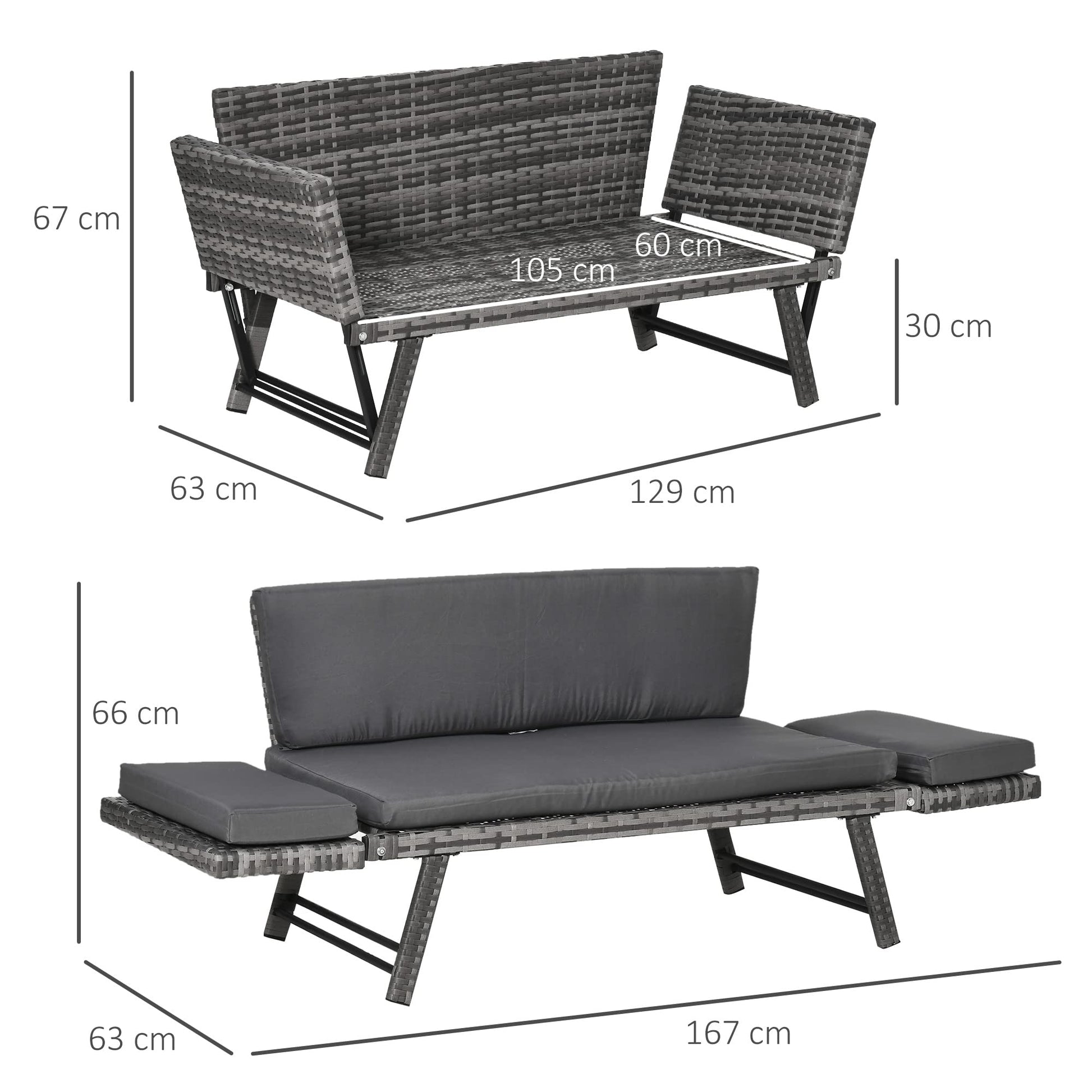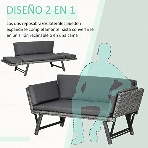 Outsunny Sofá de Ratán de 2 Plazas Convertible en Cama Individual 129x63x67 cm con Reposabrazos Abatibles y Cojines Acolchados Sofá Doble para Jardín Patio Terraza Gris