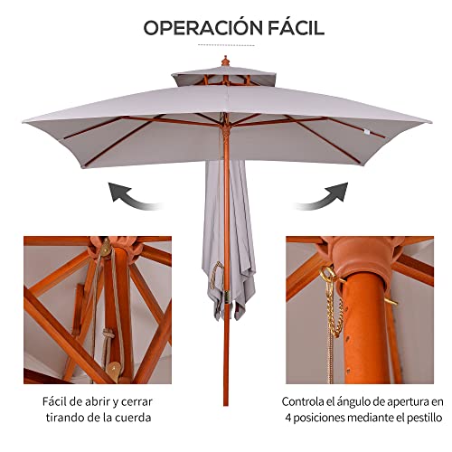 Outsunny Sombrilla de Jardín 3x3x3 m Parasol de Jardín de Bambú con Doble Techo Sistema de Polea Impermeable para Terraza Balcón Exterior Gris