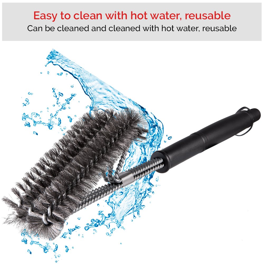 - 【360° Limpieza Eficiente】 El cepillo para parrilla de barbacoa tiene cerdas orientadas en todas las direcciones para garantizar no solo limpiar la parte superior e inferior, sino también los lados de cada barra de la parrilla sin tener que quitar la parte superior de la parrilla.