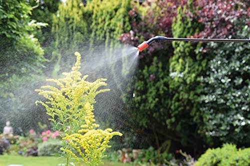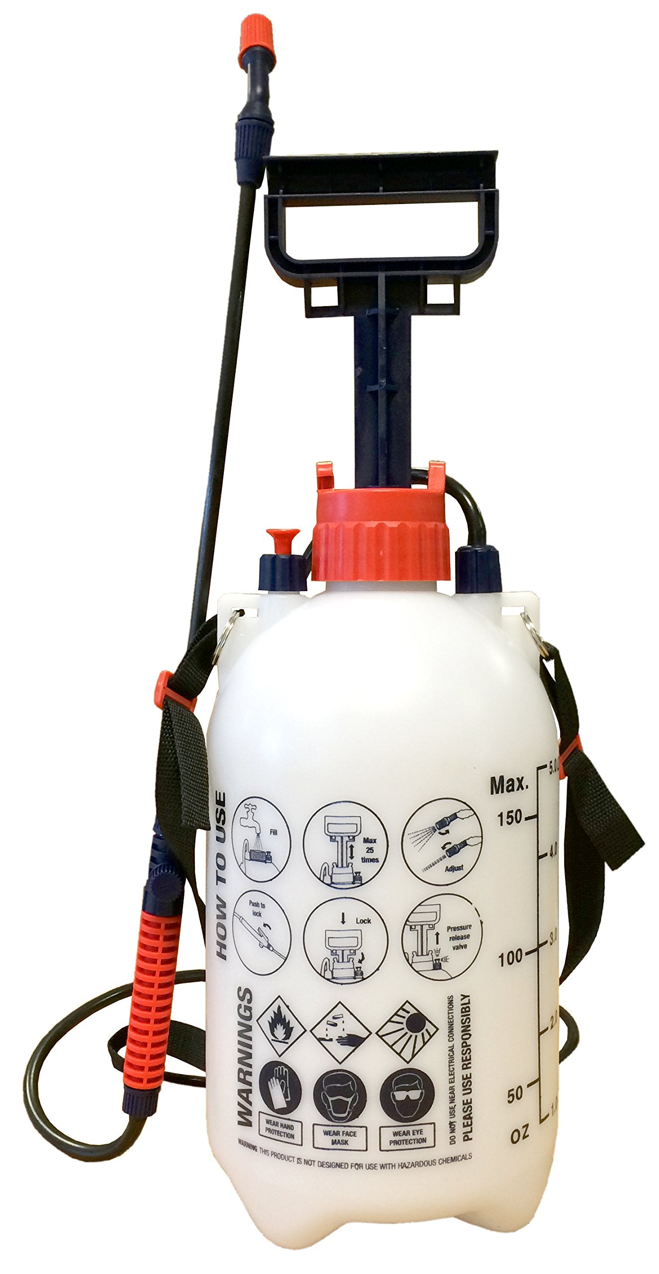 - Pulverizador a presión con acción de bomba de 5 litros (1.3 galones) con válvula de liberación de presión y correa para el hombro