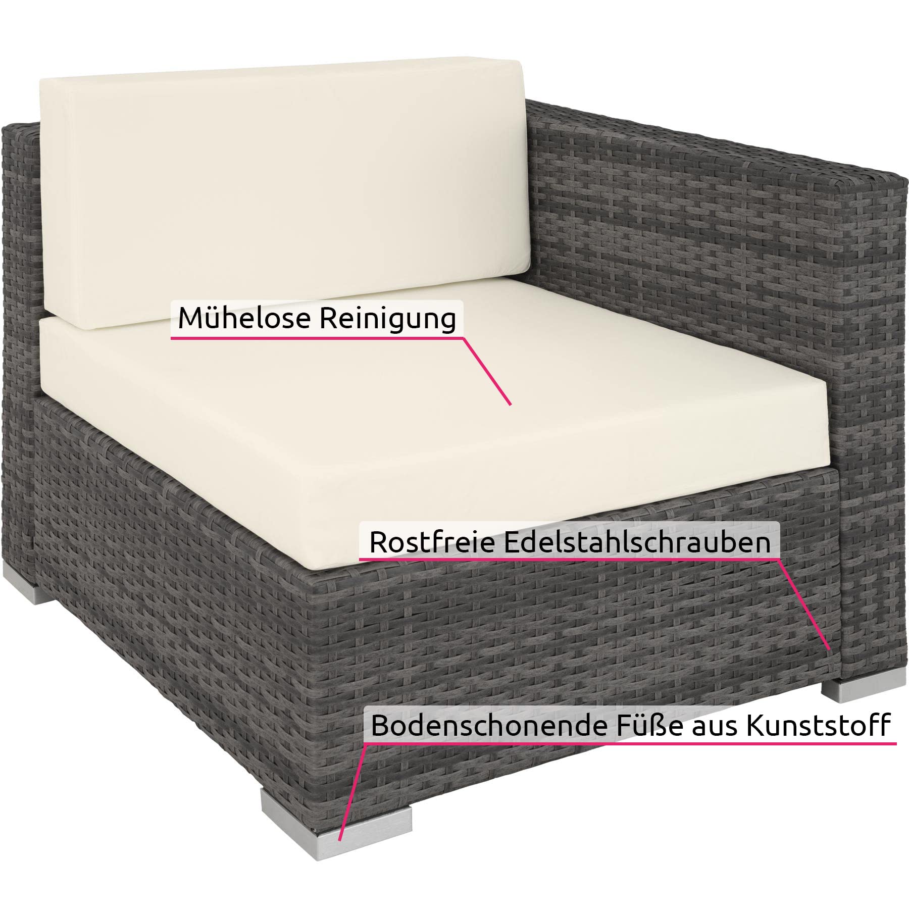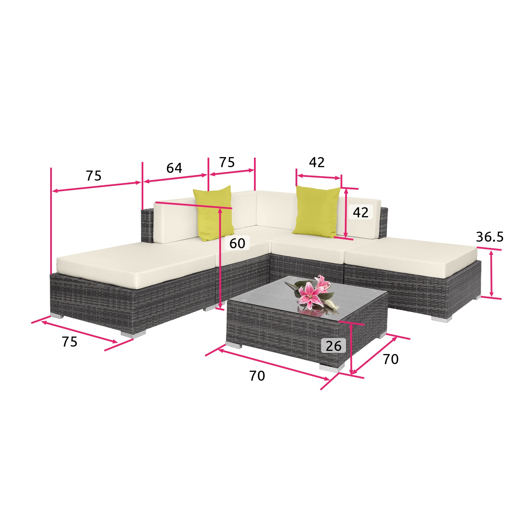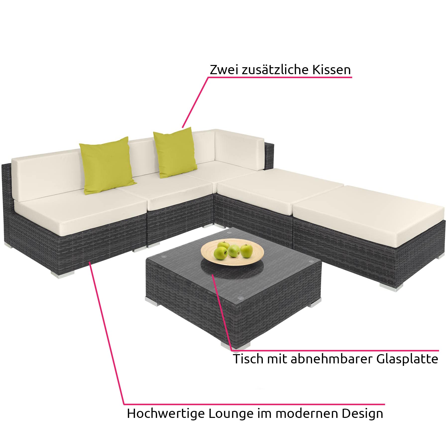 Ya sea en el jardín o en el interior, el conjunto de sofás de polirratán para jardín de tectake se puede utilizar de múltiples formas y formatos y embellecerá visualmente su jardín, terraza, invernadero o salón. La elegante mesa es el lugar perfecto para colocar bebidas y refrigerios para que pueda disfrutar de una relajada experiencia gastronómica al aire libre. Las cómodas sillas cuentan con cojines gruesos que seguramente brindarán horas de relax y se comunicarán con amigos y familiares. El juego de sillas para jardín convence no sólo por su elegante aspecto, sino también por su larga vida útil gracias al tejido de poliratán. Lo más destacado Muebles de mimbre de alta calidad en estilo moderno Adecuado para jardín, balcón, terraza, salón o invernadero Cojín de asiento suave y desmontable para una comodidad óptima, tapizado de aproximadamente 10 cm de espesor Mesa con superficie de vidrio Fácil de limpiar Incluye clips para mantener juntos los elementos individuales del asiento Aluminio estructura 2 almohadas adicionales Especificaciones técnicas Taburete AnxPxAl aproximadamente 75 x 75 x 36,5 cm incluido el acolchado Peso aprox. 4,4 kg Sillón An x P x Al aprox.64 x 75 x 60 cm Peso aprox. 5,2 kg Sillón esquinero An x P x Al aprox. 75 x 75 x 60 cm Peso aprox. 8,1 kg Cojín adicional verde aprox. 42 x 42 x 15 cm Mesa An x P x Al aprox. 70 x 70 x 26 cm Peso aprox. 8 kg Tapicería Poliéster tiene un grosor de cojín de aproximadamente 10 cm Peso aproximado 46,4 kg La entrega incluye 2 sillones 1 sillones de esquina 2 almohadas adicionales 2 taburetes 1 mesa con tapa de vidrio Instrucciones de montaje ilustradas y juego de montaje y clips KIT DE PRODUCTOS DESMONTADOS base de aluminio sin óxido