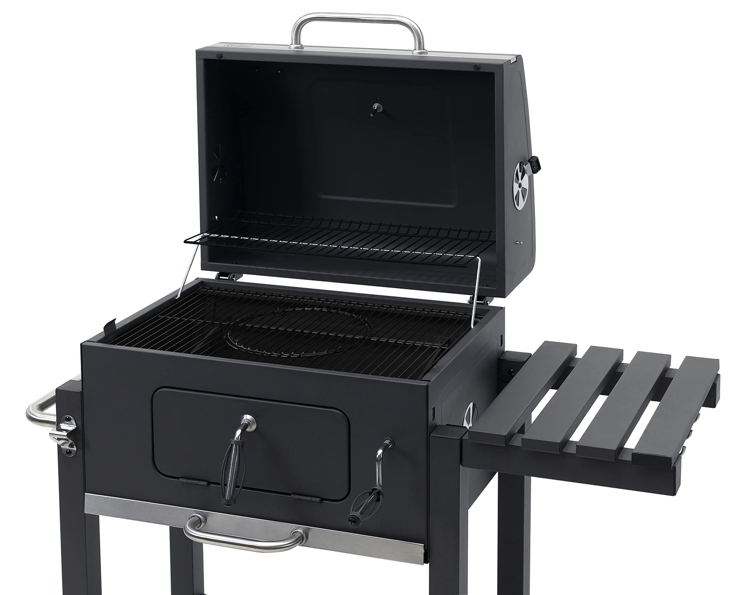 - Nota: la tapa fácil de manejar también te permite asar alimentos en el espacio cerrado, en lugar de colocarlos directamente sobre el carbón encendido. La chimenea garantiza que el «Toronto XXL» también sea perfecto para ahumar alimentos.