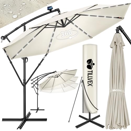 tillvex 300 cm Sombrilla Excentrico con 32 Luces LED Solar | Parasol para Terraza Jardín Balcón Patio | con Manivela y Base en Cruz, Giratorio 360º, Protección UV
