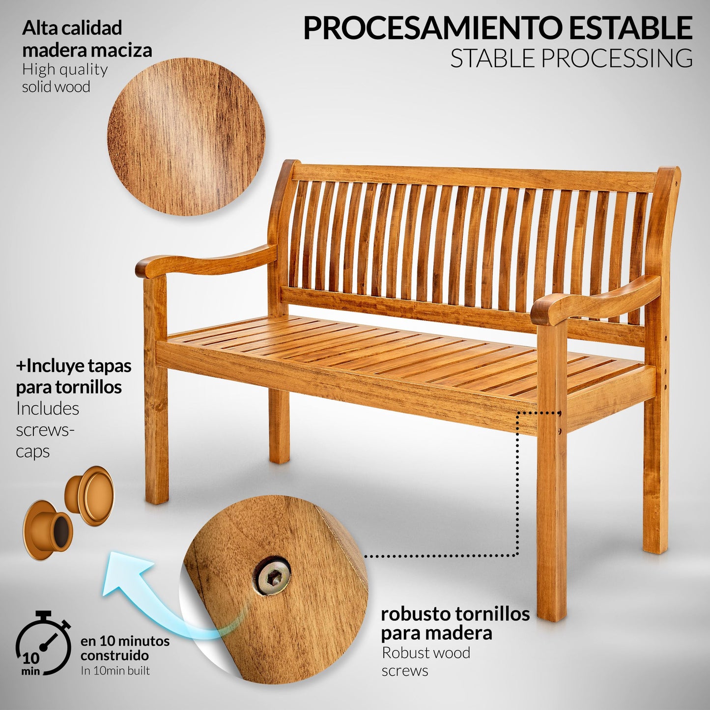 - MUY FÁCIL DE CUIDAR: Nuestro banco de madera viene con instrucciones ilustradas y se puede montar en 10 minutos. Si el banco de jardín se ensucia, se puede limpiar fácilmente con un paño húmedo.