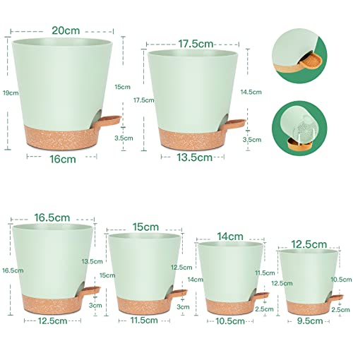 Warmplus Macetas de Riego Automático para Interior, 20/17.5/16.5/15/14/12.5cm Macetas de Plástico con Agujeros de Drenaje Plato y Depósito, Macetas de Interior para Todas Las Plantas de Casa, Verde